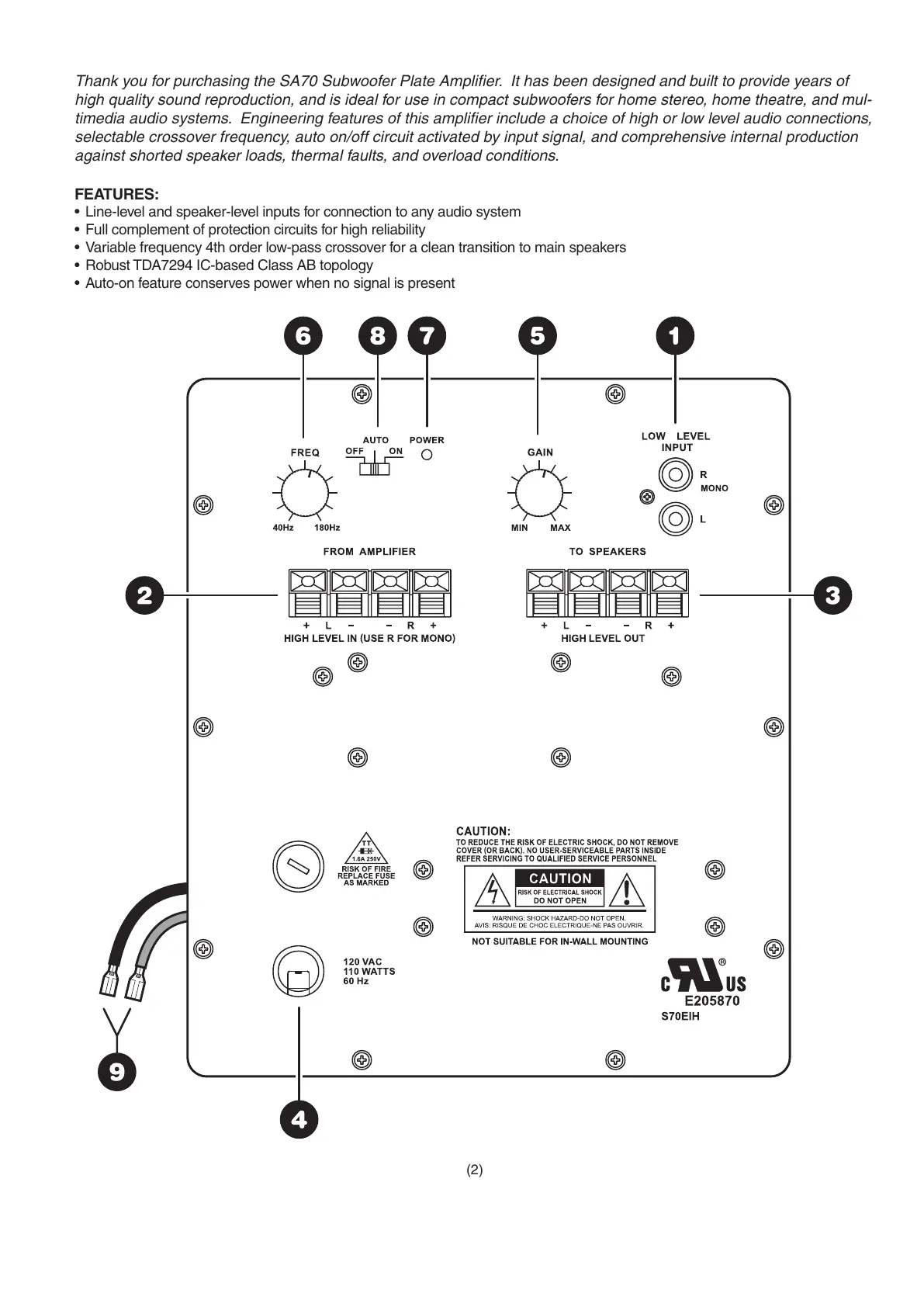 Thank you for purchasing the SA70 Subwoofer Plate Amplifier. It has been designed and built to provide years of
