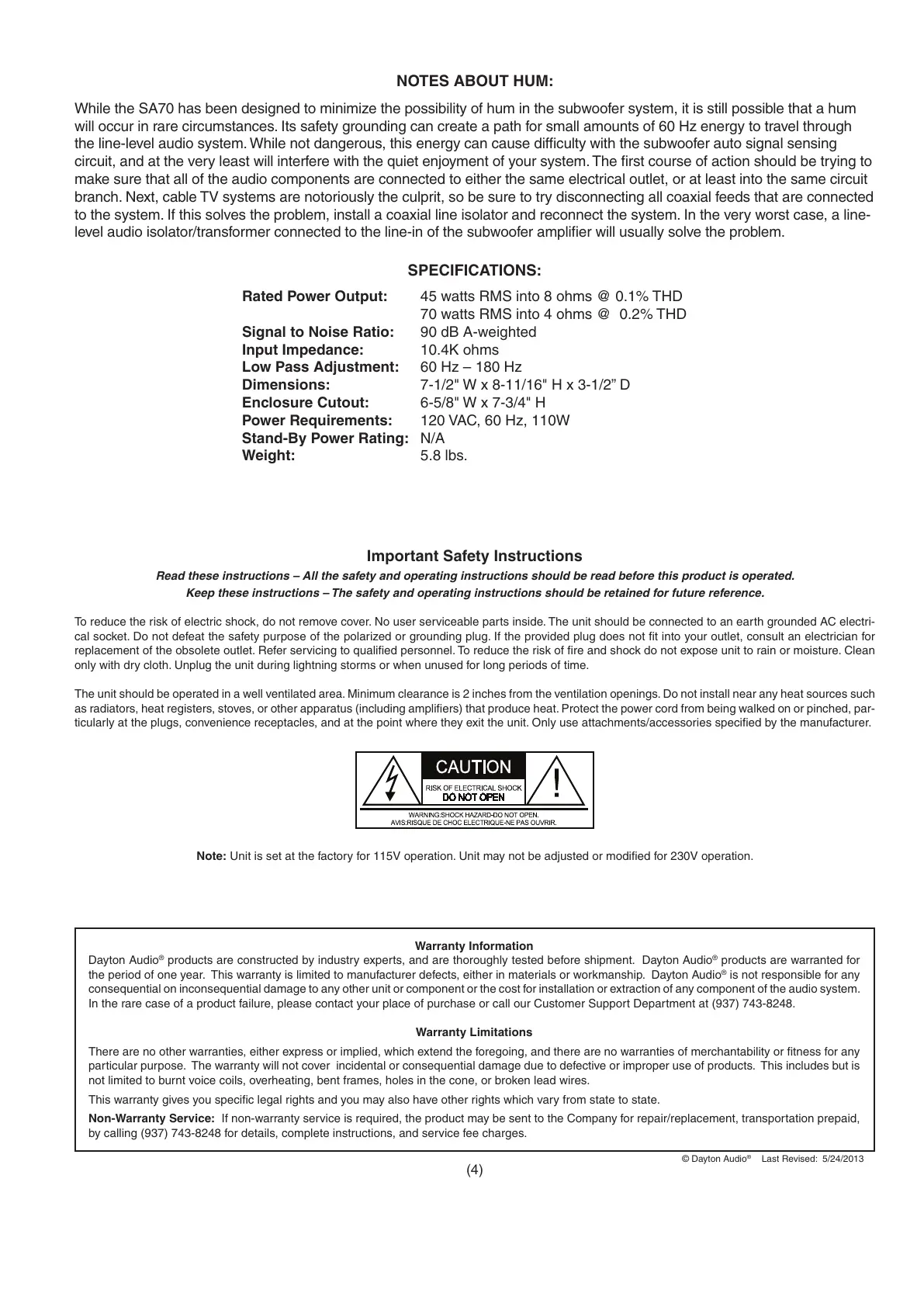 the period of one year. This warranty is limited to manufacturer defects, either in materials or workmanship. Dayton Audio