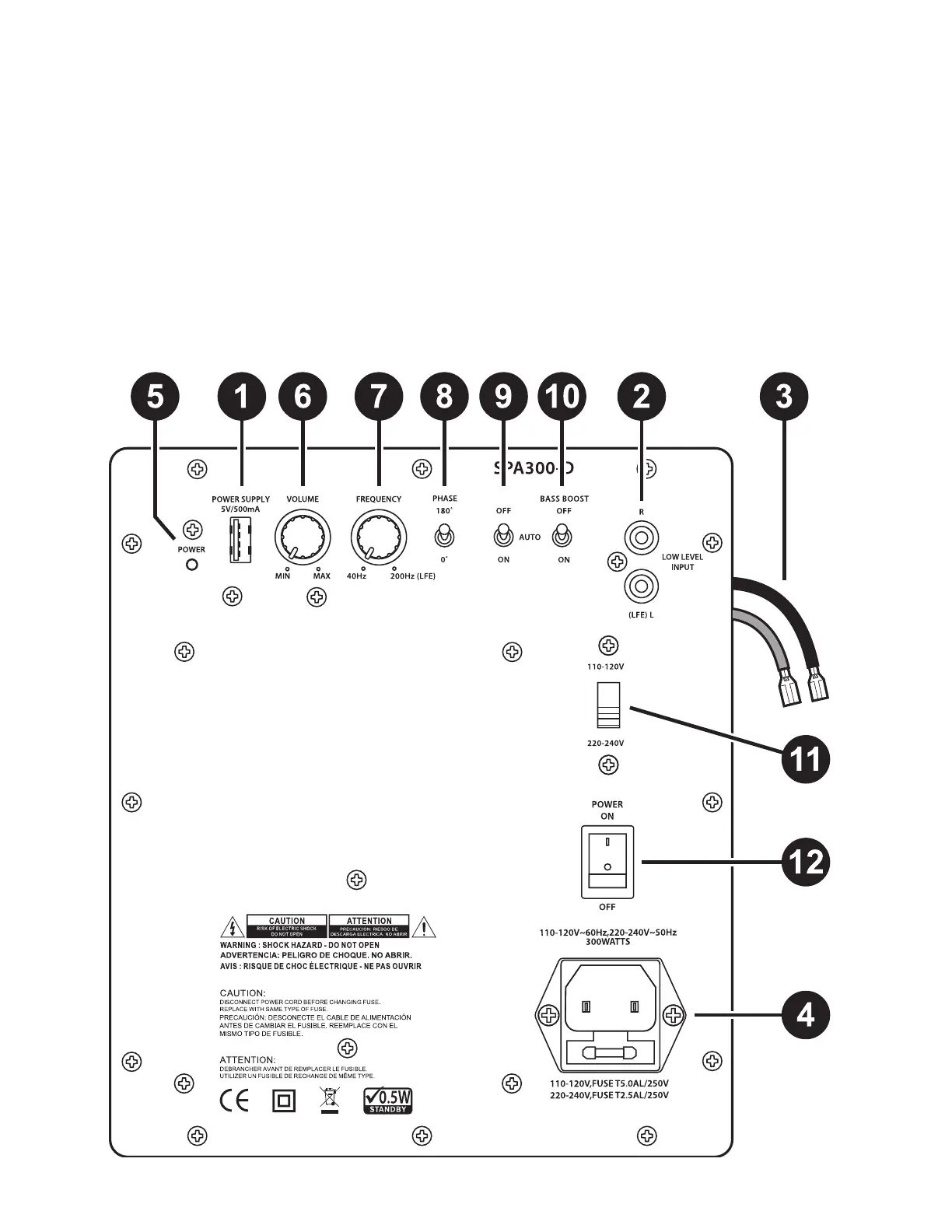 boost (6 dB @ 30 Hz), auto on/off circuit activated by input signal, and comprehensive internal protection against shorted speaker