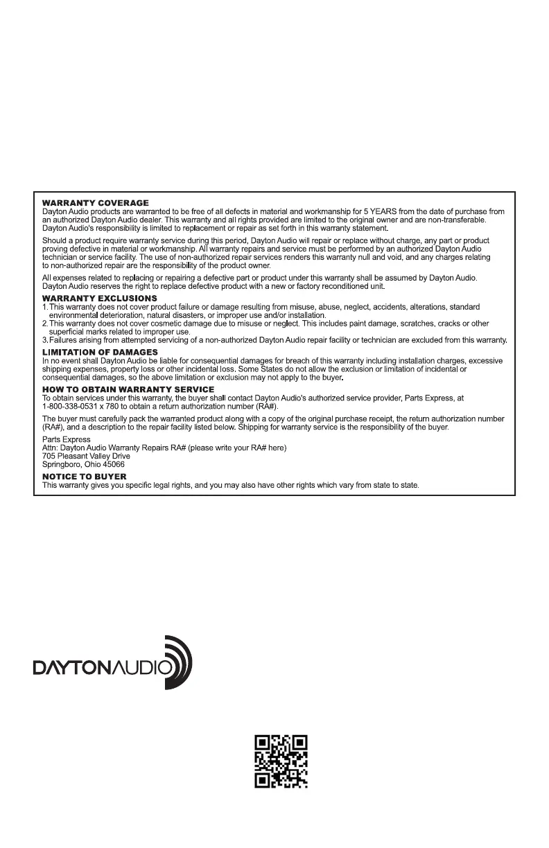 DaytonAudio SUB-800 - Warranty and Service Information; Warranty Coverage & Exclusions; Obtaining Warranty Service; Limitation of Damages & Notice