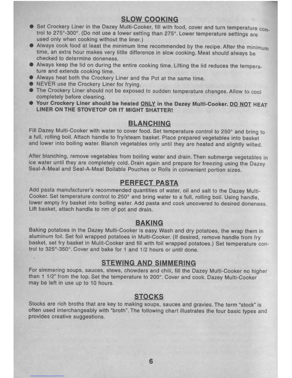 Dazey 2200 - Slow Cooking and Other Cooking Methods; Slow Cooking; Blanching; Perfect Pasta
