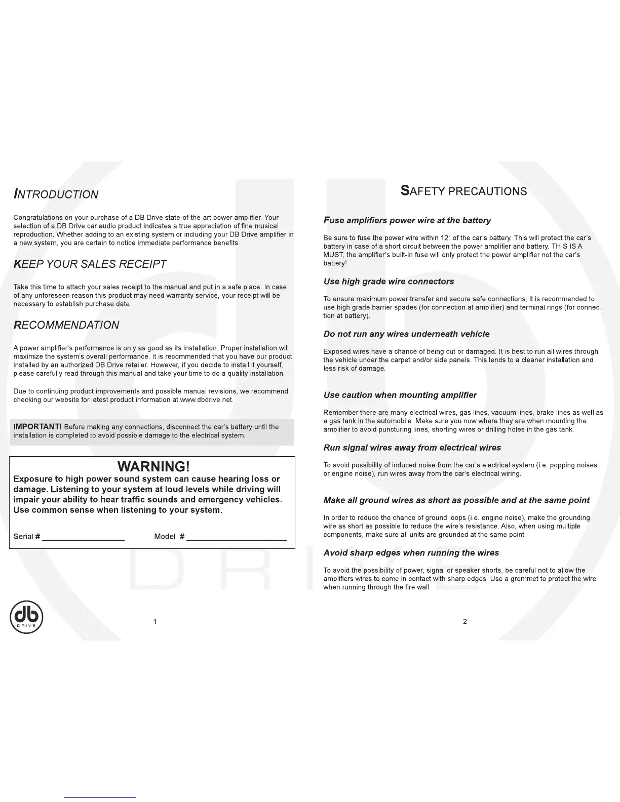 DB Drive SA2000.1D - Introduction and Safety; General Safety Precautions; Wire Installation Safety; Amplifier Mounting Safety