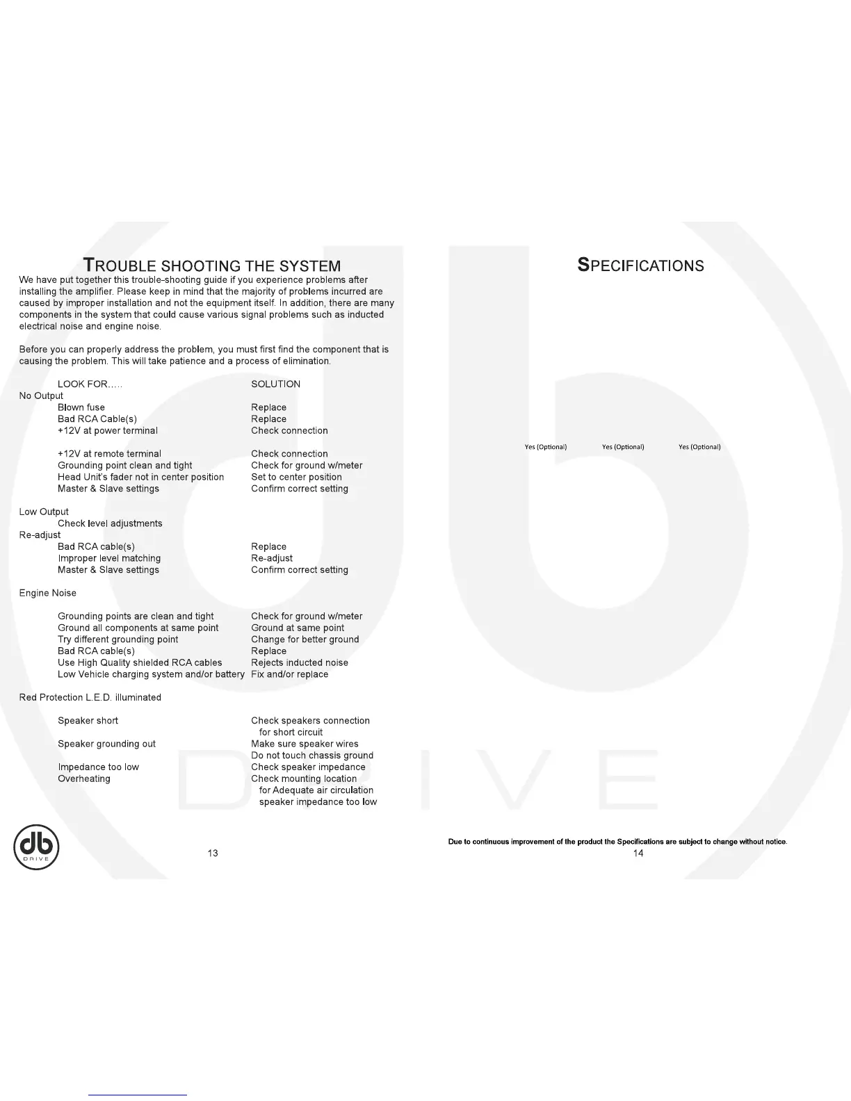 DB Drive SA600.4 - Troubleshooting and Specifications; Trouble Shooting the System; No Output Troubleshooting; Low Output Troubleshooting