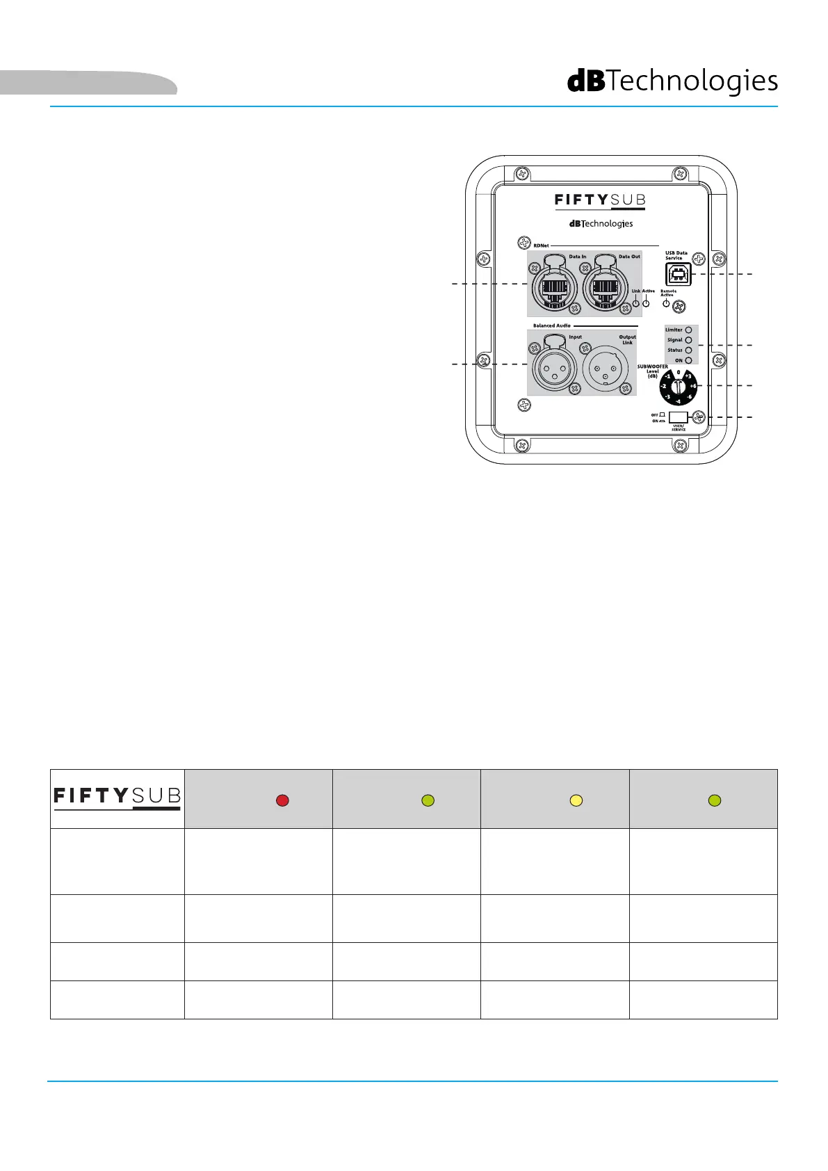 Die LEDs zeigen unmittelbar den Status des Subwoofers nach der in folgender Übersicht veranschaulichten Logik