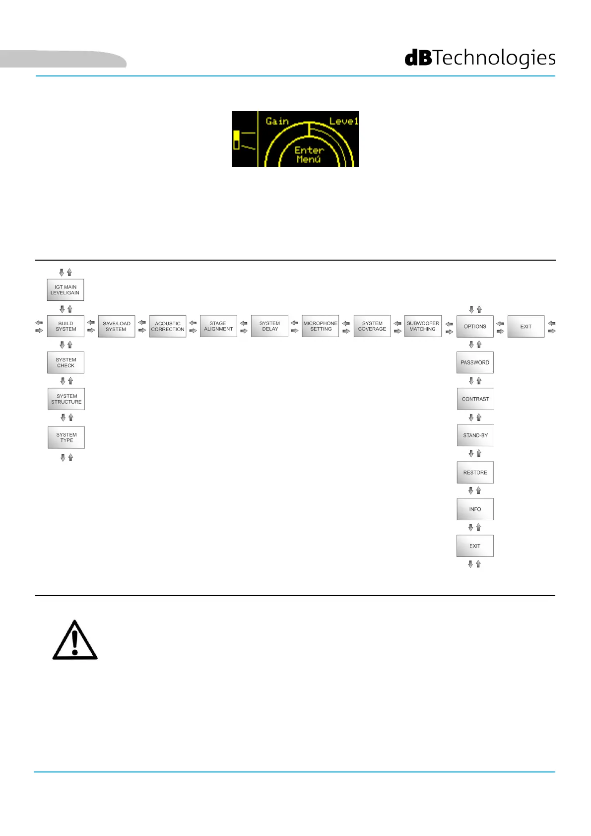 From this screen, pressing the rotary push encoder allows to access the different menus, whose general structure