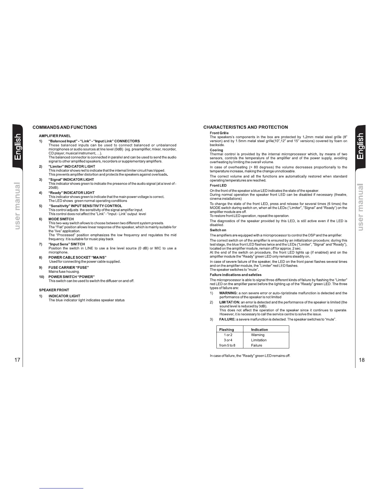 dB Technologies OPERA 515DX - English Commands and Functions; Amplifier Panel Controls and Indicators; English Characteristics and Protection; Front Grille, Cooling, and LED Functions