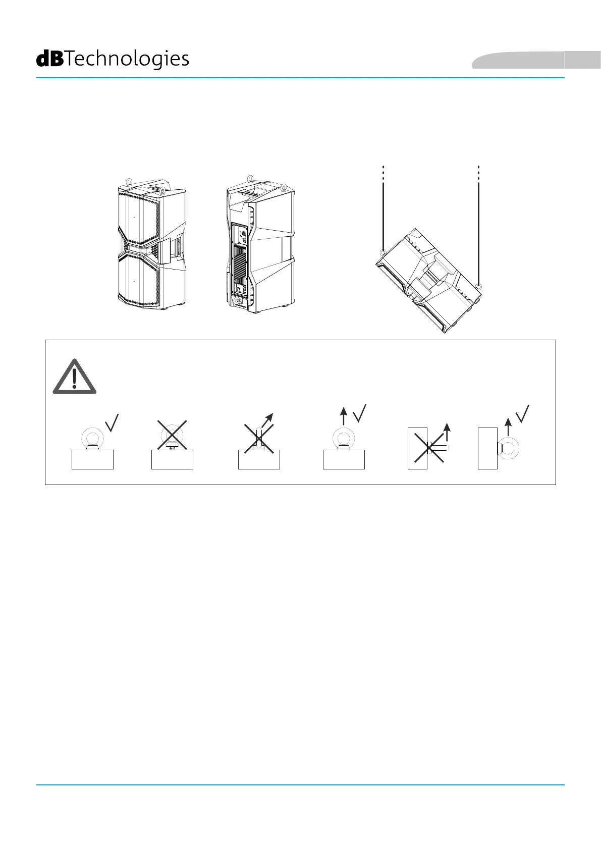 The speakers can also be suspended using eyebolts. The positioning is shown in the figure. The rear eyebolt can