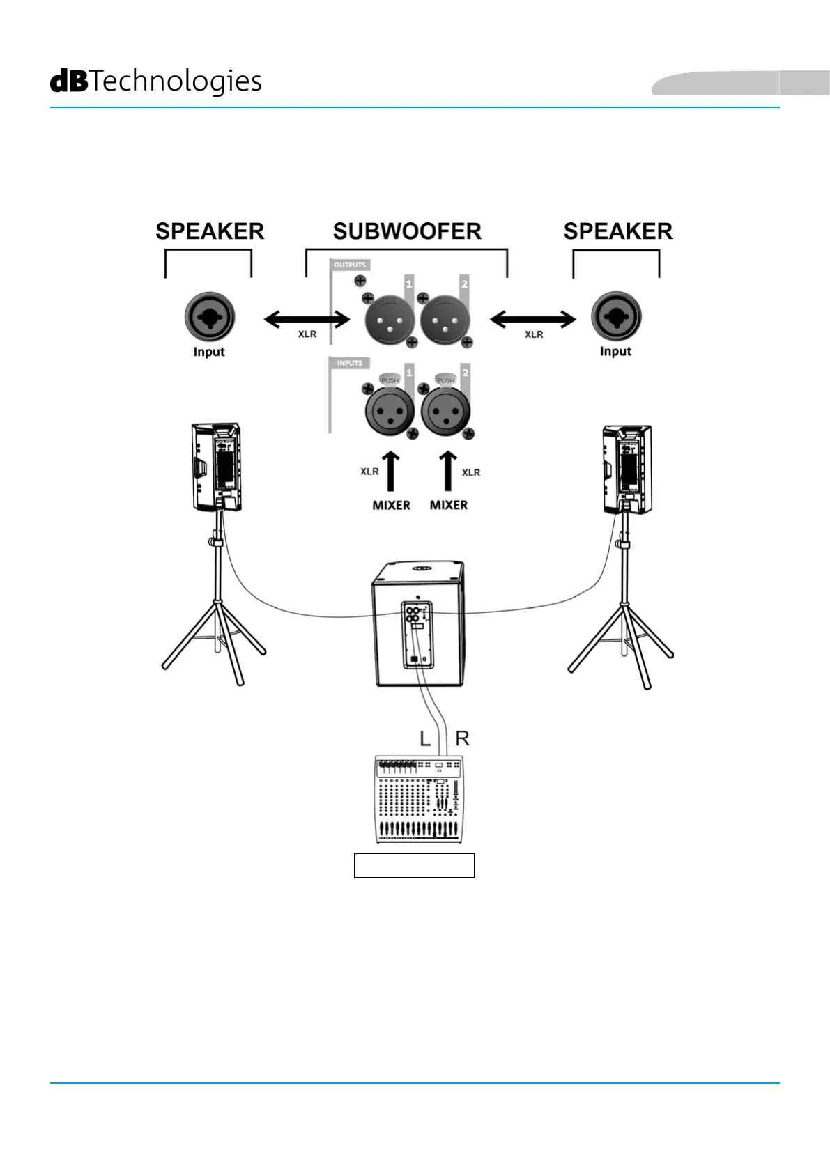 1. Conectar las salidas L, R del mixer a las INPUTS 1 y 2 del subwoofer, respectivamente.