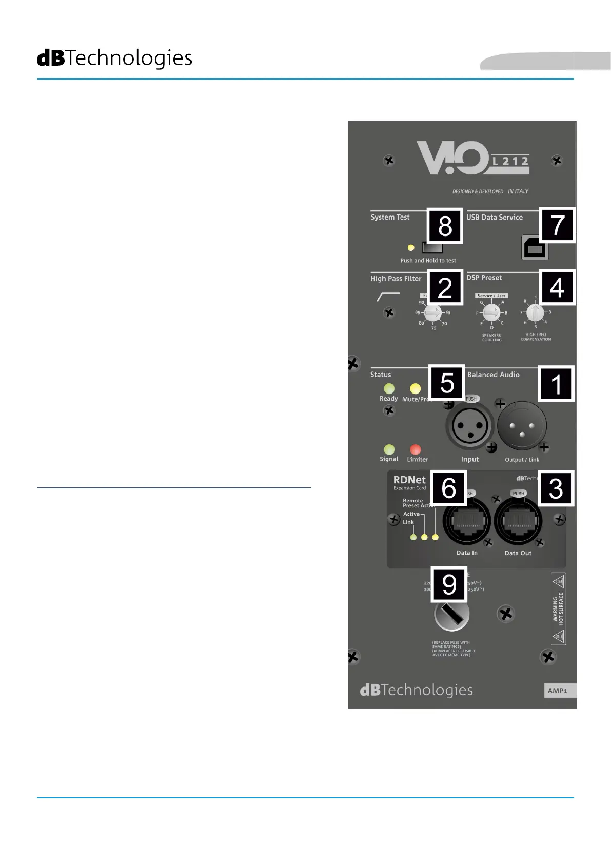 Bedienelemente des Verstärker-Bedienfelds von der RDNet-