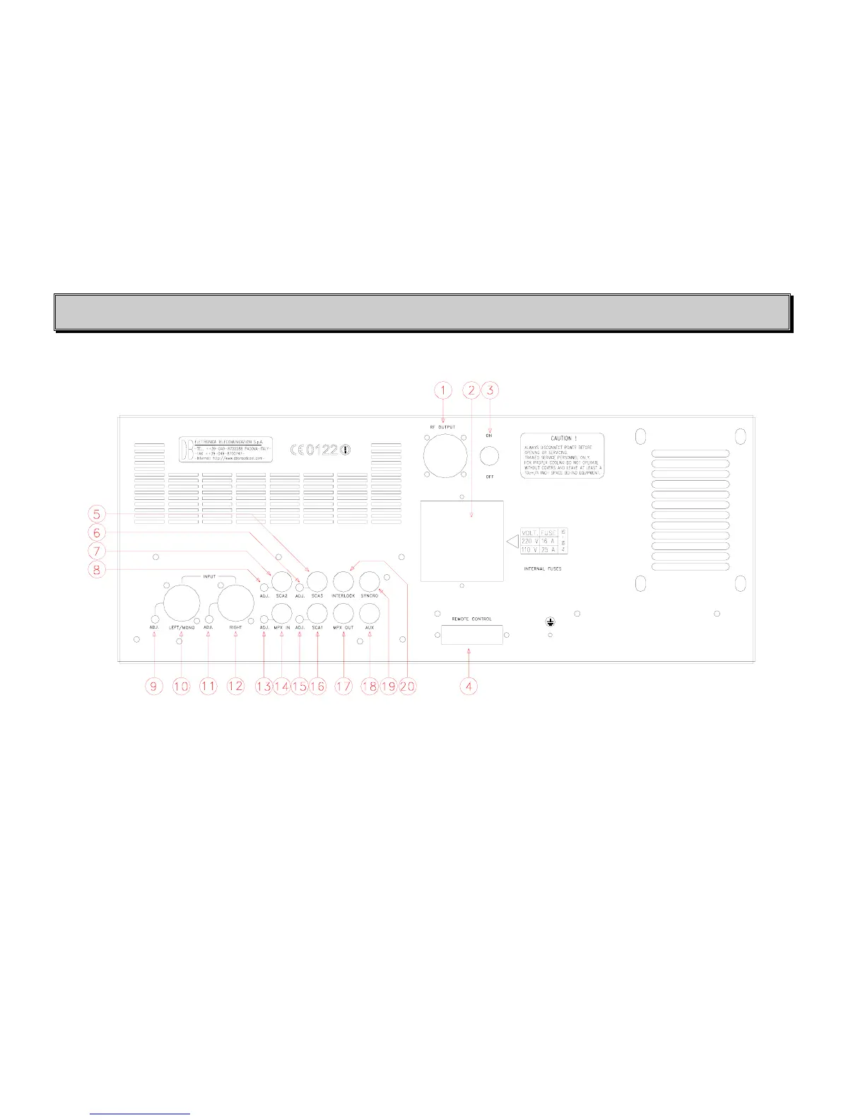 1) RF output DIN 7/16” connector 7) SCA2 input BNC connector 13) MPX input level adj. 19) Sync. input BNC connector
