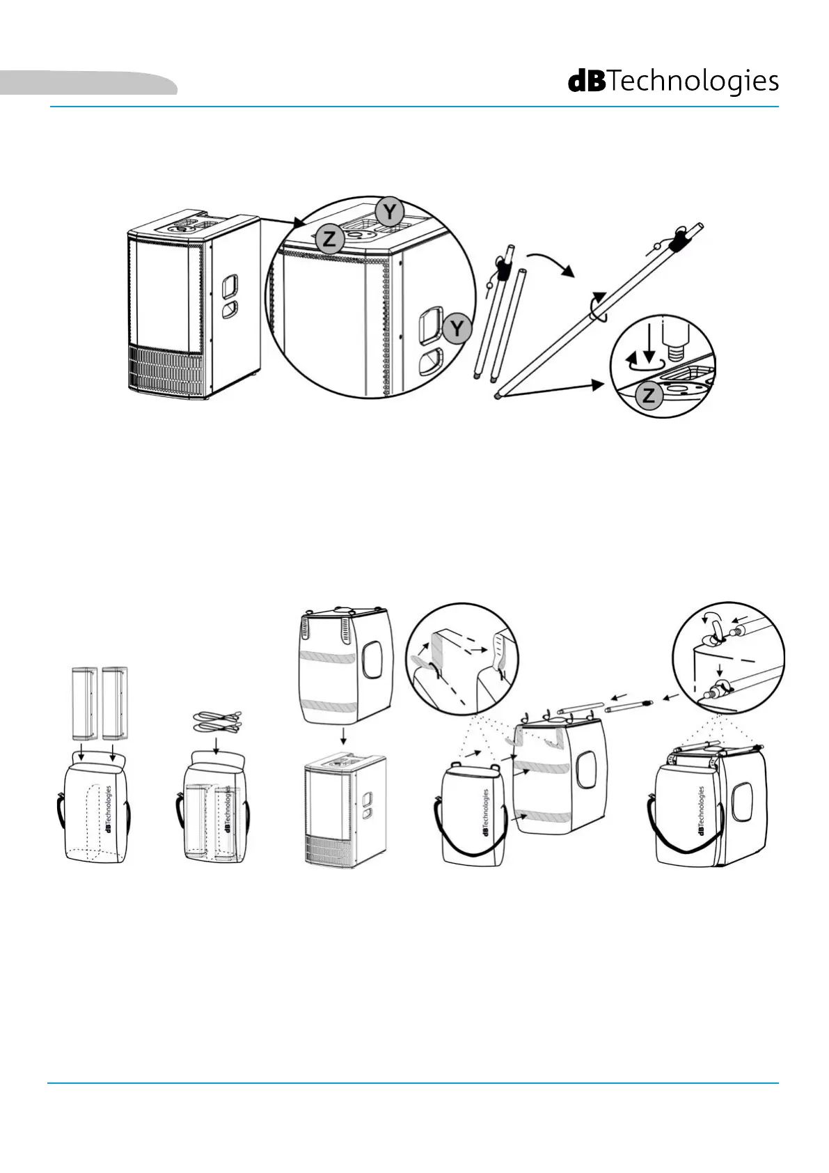 • Put the two parts of the telescopic pole into the four eyelets at the top of the subwoofer cover and adjust