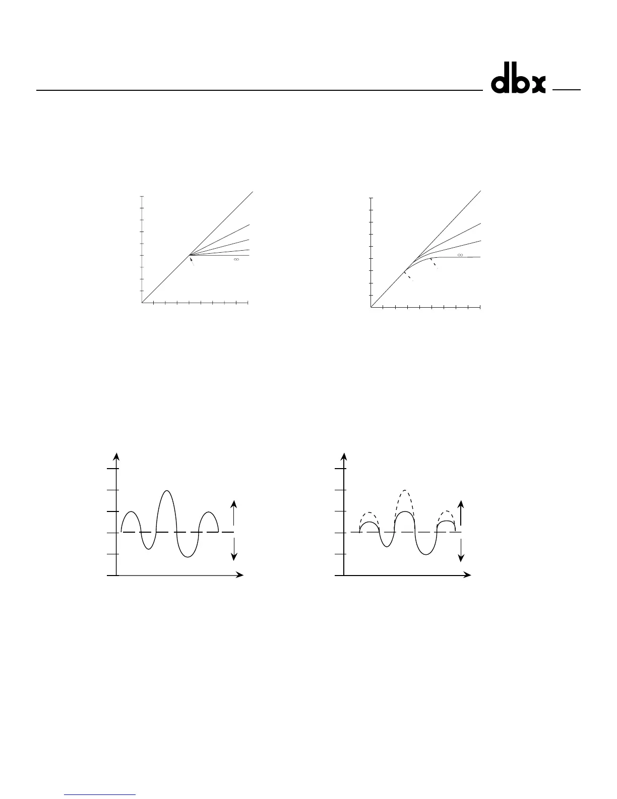 La Figura 3 indica el efecto de una compresión de 2:1 sobre una señal a medida que sube por encima y