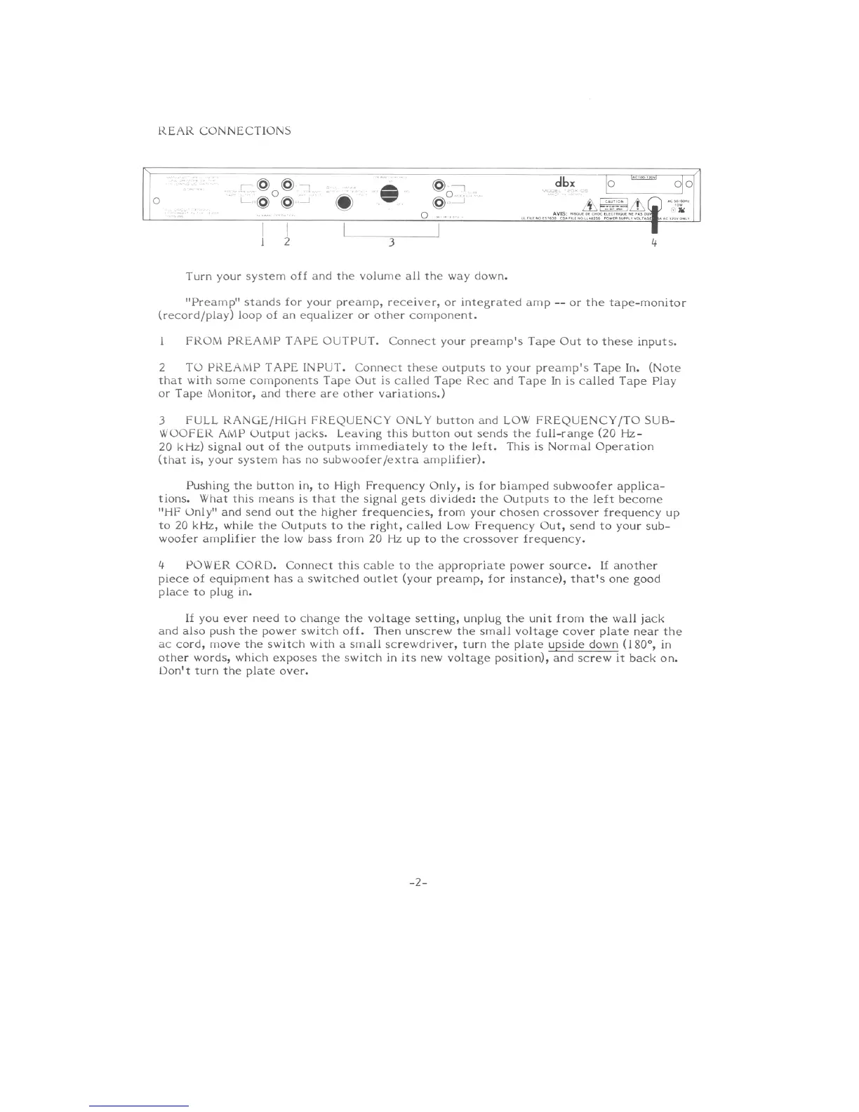 dbx 120X - REAR CONNECTIONS; From Preamp Tape Output; To Preamp Tape Input; Full Range;High Frequency Output