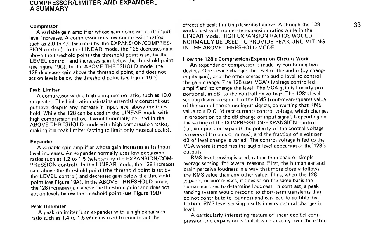 dbx 128 - COMPRESSOR;LIMITER AND EXPANDER, A SUMMARY; Compressor and Peak Limiter Functions; Expander and Peak Unlimiter Functions; Internal Circuit Operation