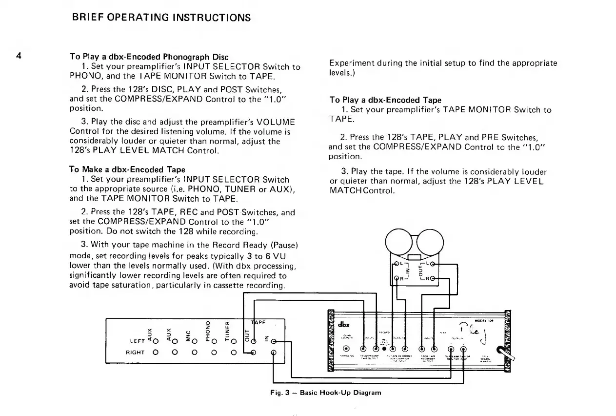 dbx 128 - BRIEF OPERATING INSTRUCTIONS; Playing dbx-Encoded Discs; Making dbx-Encoded Tapes; Playing dbx-Encoded Tapes