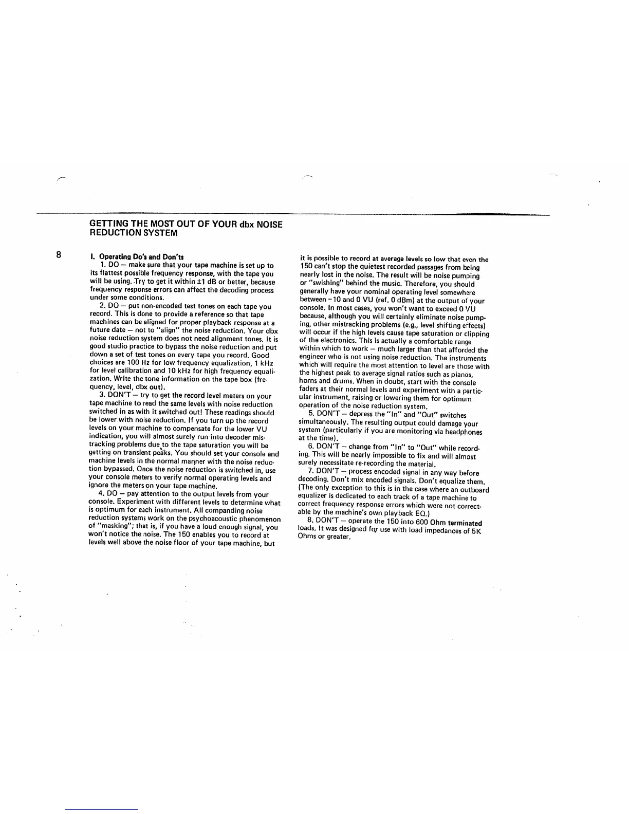 dbx 150 - Optimizing dbx Noise Reduction Performance; Operating Dos and Donts