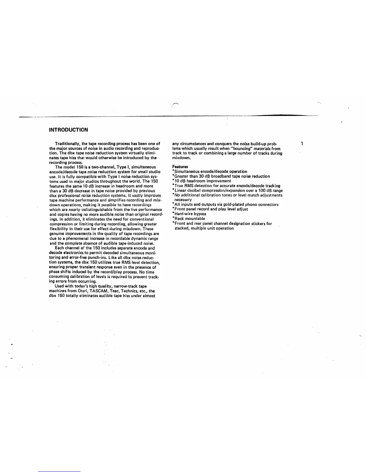 dbx 150 - Key Features of the dbx Model 150