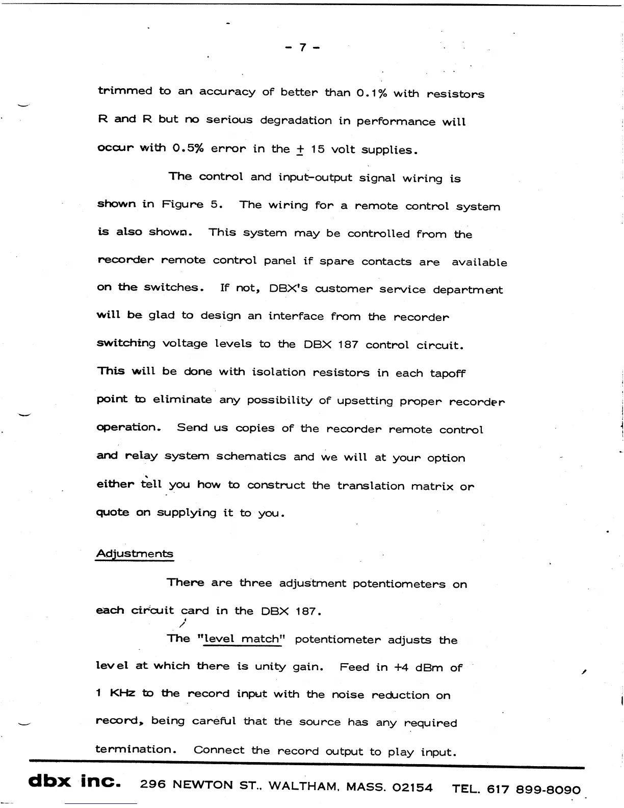 dbx 187 - Adjustments; Level Match Potentiometer Adjustment