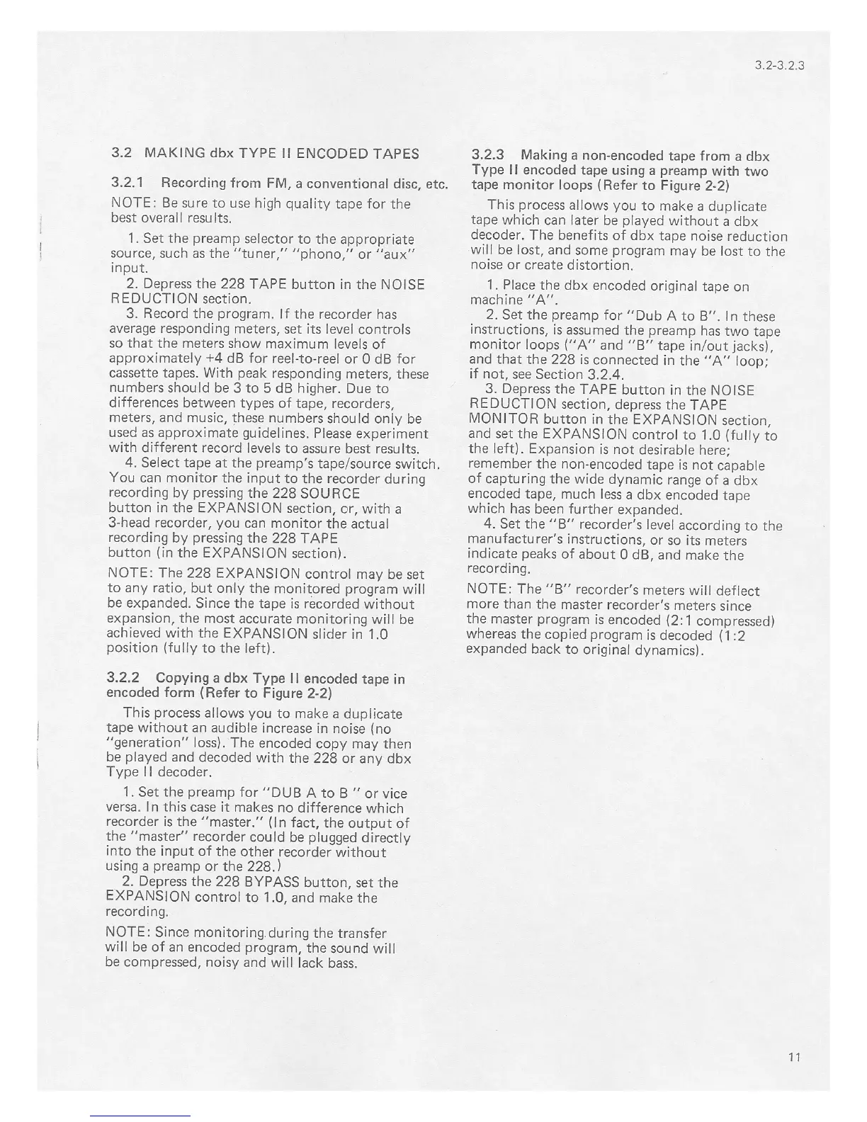 dbx 228 - Operation - Making Encoded Tapes; Recording from Sources; Copying dbx Type II Tapes; Making Non-Encoded Tape from dbx Type II