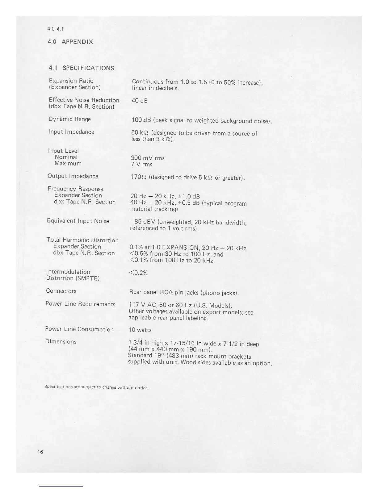 dbx 228 - Appendix - Specifications; Technical Specifications