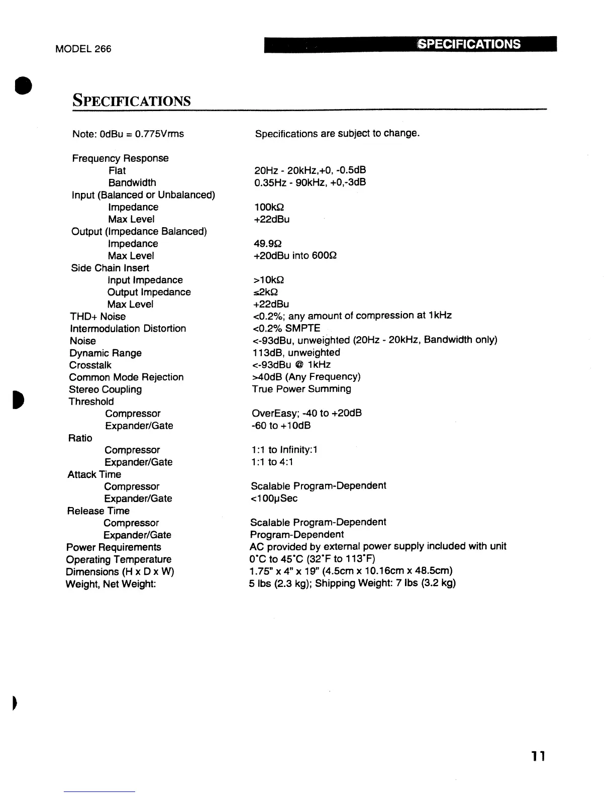 dbx 266 - SPECIFICATIONS; Technical Specifications