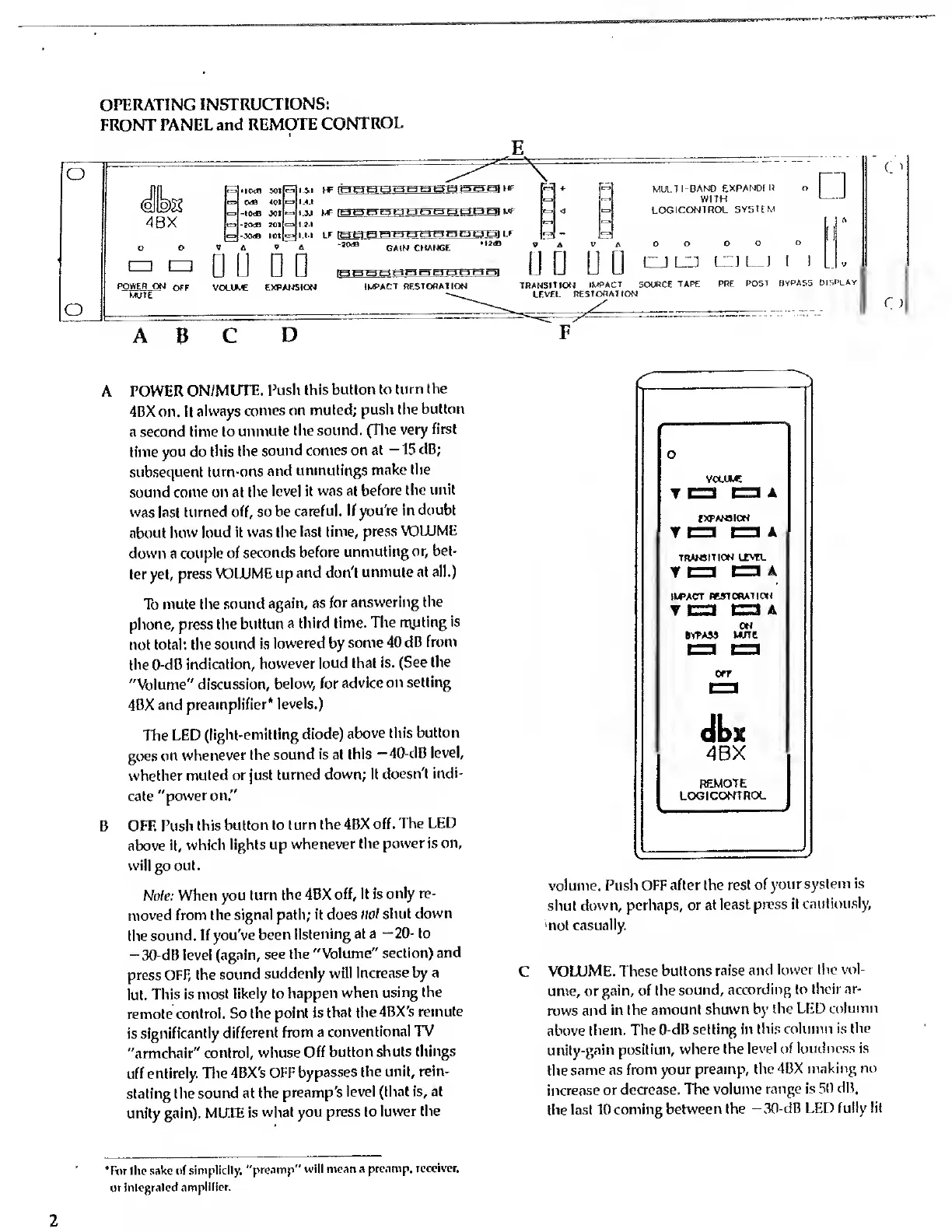 dbx 4BX - Operating Instructions; Front Panel and Remote Control Overview; Power On;Mute and Off Buttons; Volume Adjustment