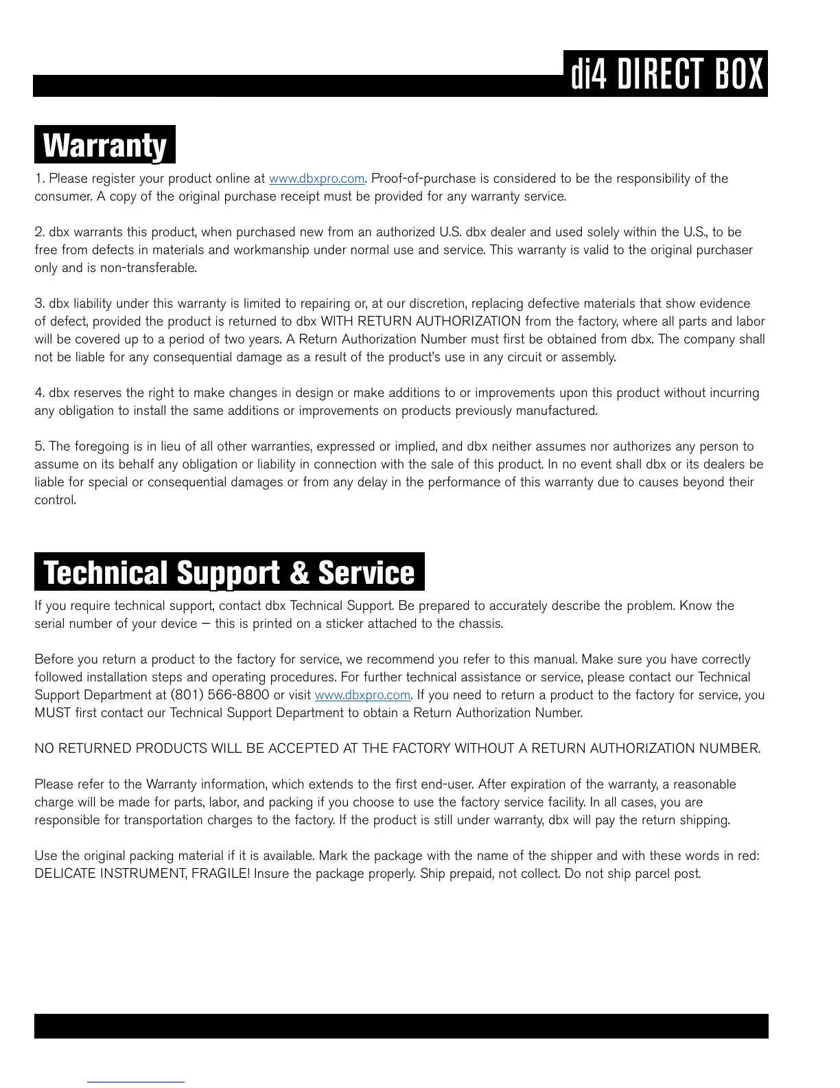 Support Department at (801) 566-8800 or visit www.dbxpro.com. If you need to return a product to the factory for service, you