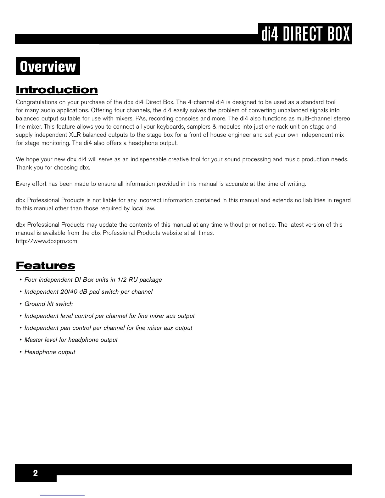 Congratulations on your purchase of the dbx di4 Direct Box. The 4-channel di4 is designed to be used as a standard tool