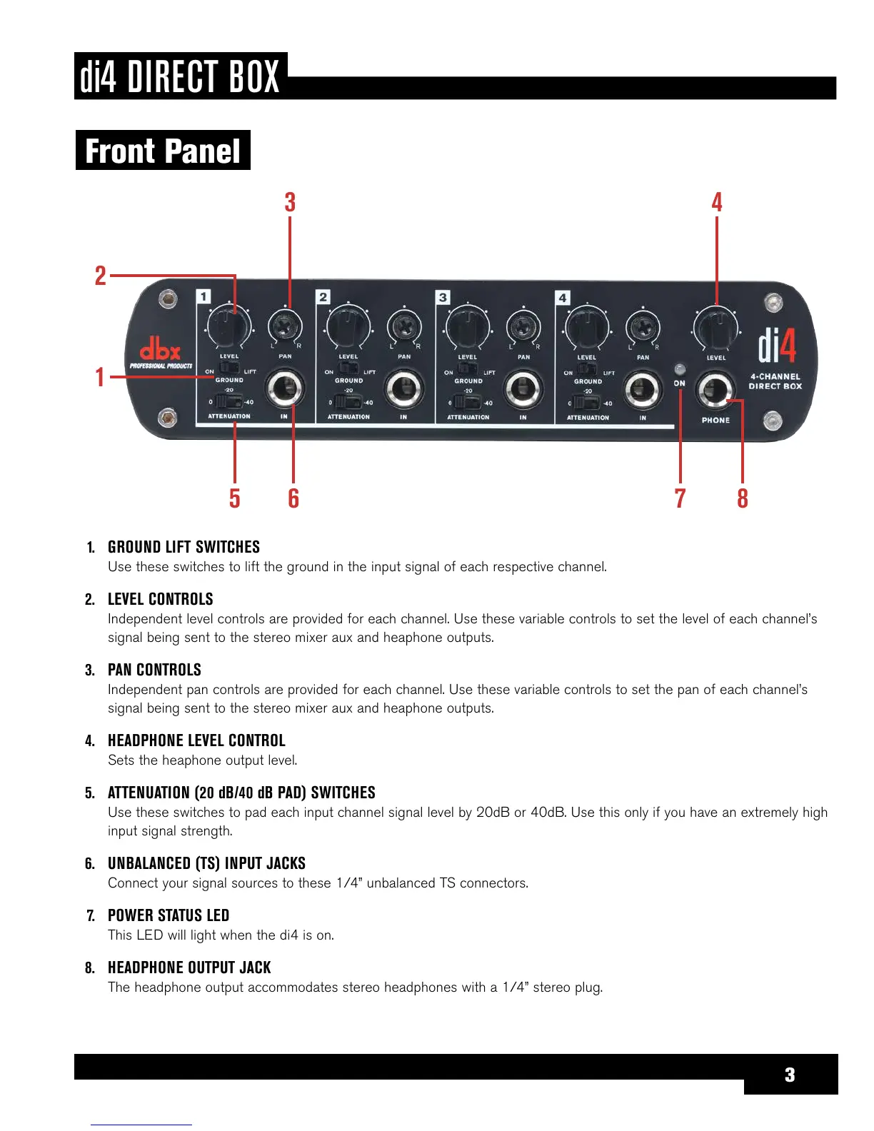 Independent level controls are provided for each channel. Use these variable controls to set the level of each channel’s