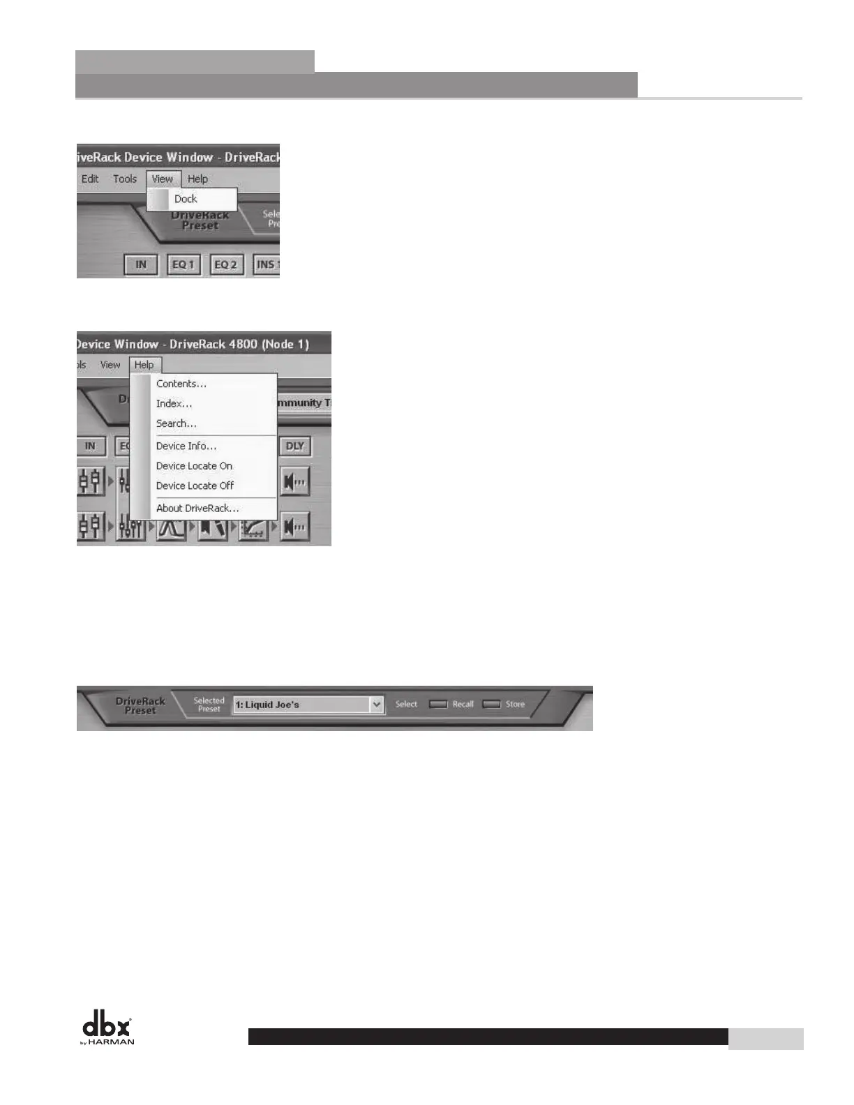 system. The Locate function flashes the front panel display. The About DriveRack menu item provides