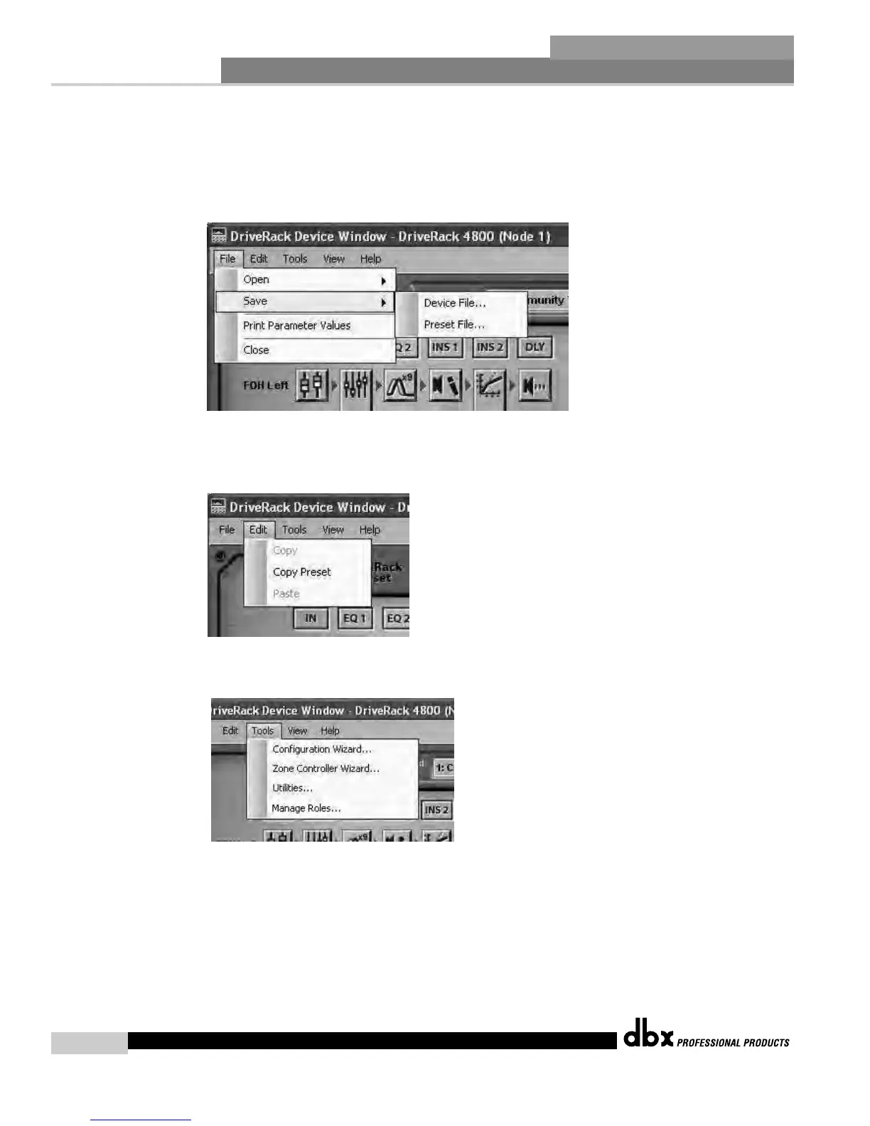The Device File Menu provides the ability to Open and Save Device and Preset Files to the computer as