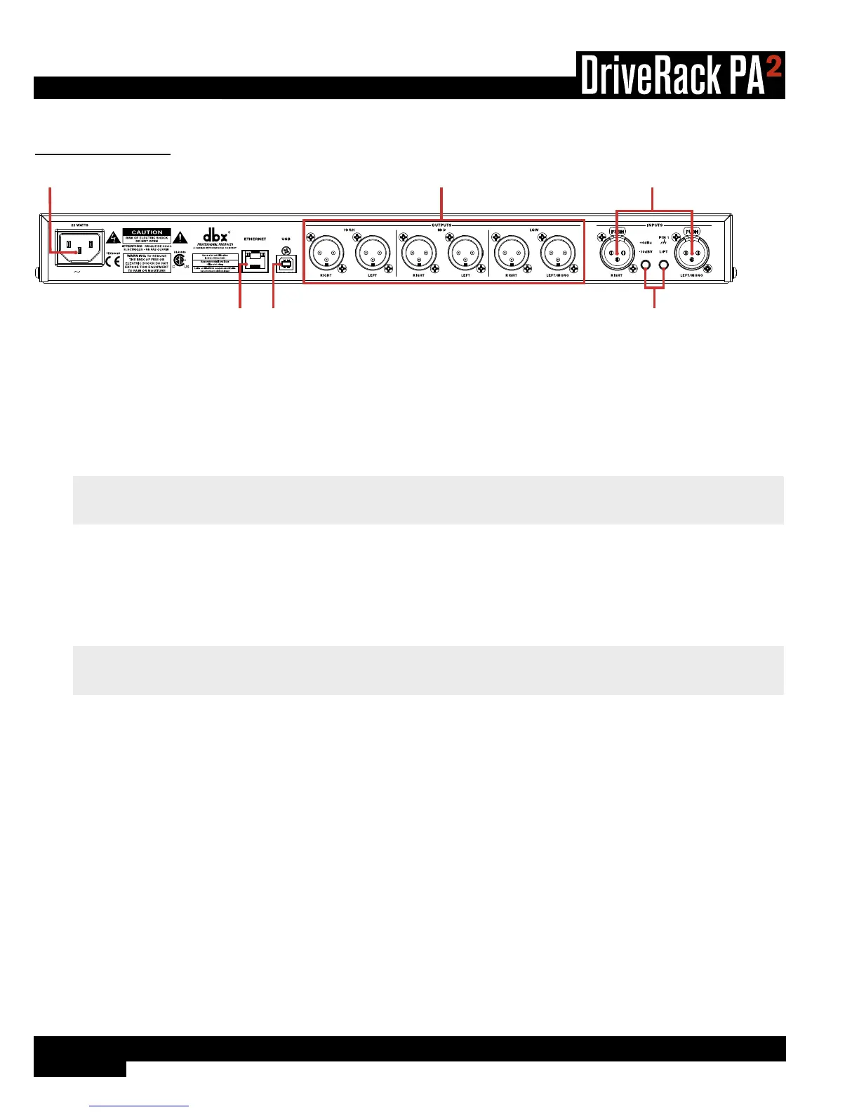 Connect the included IEC power cord to this power inlet. The DriveRack PA2 ships from the factory configured for one