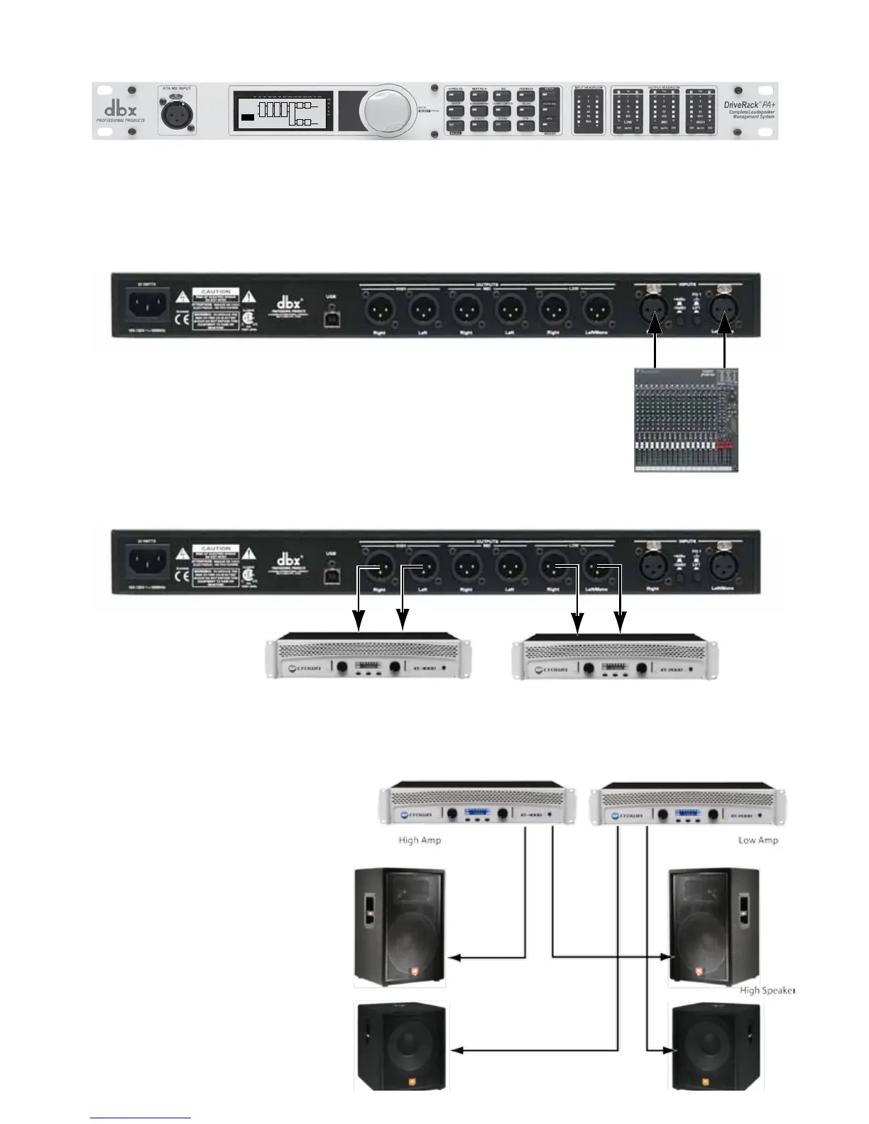 Connect the DriveRack’s Left and Right High outputs to the inputs of the High Amp and the Left