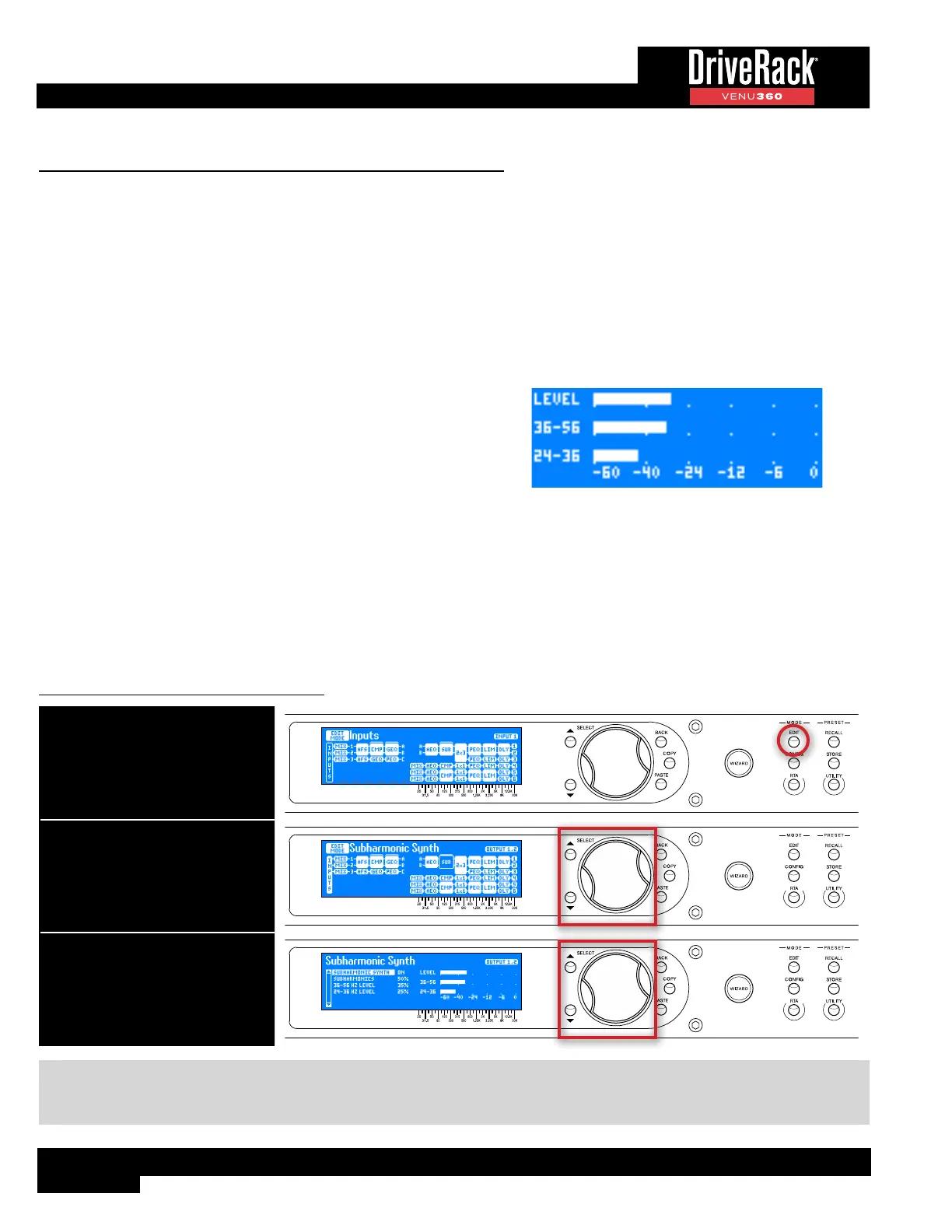When using an aux-fed subwoofer configuration, the VENU360 allows the sub-synth effect to be applied only to the