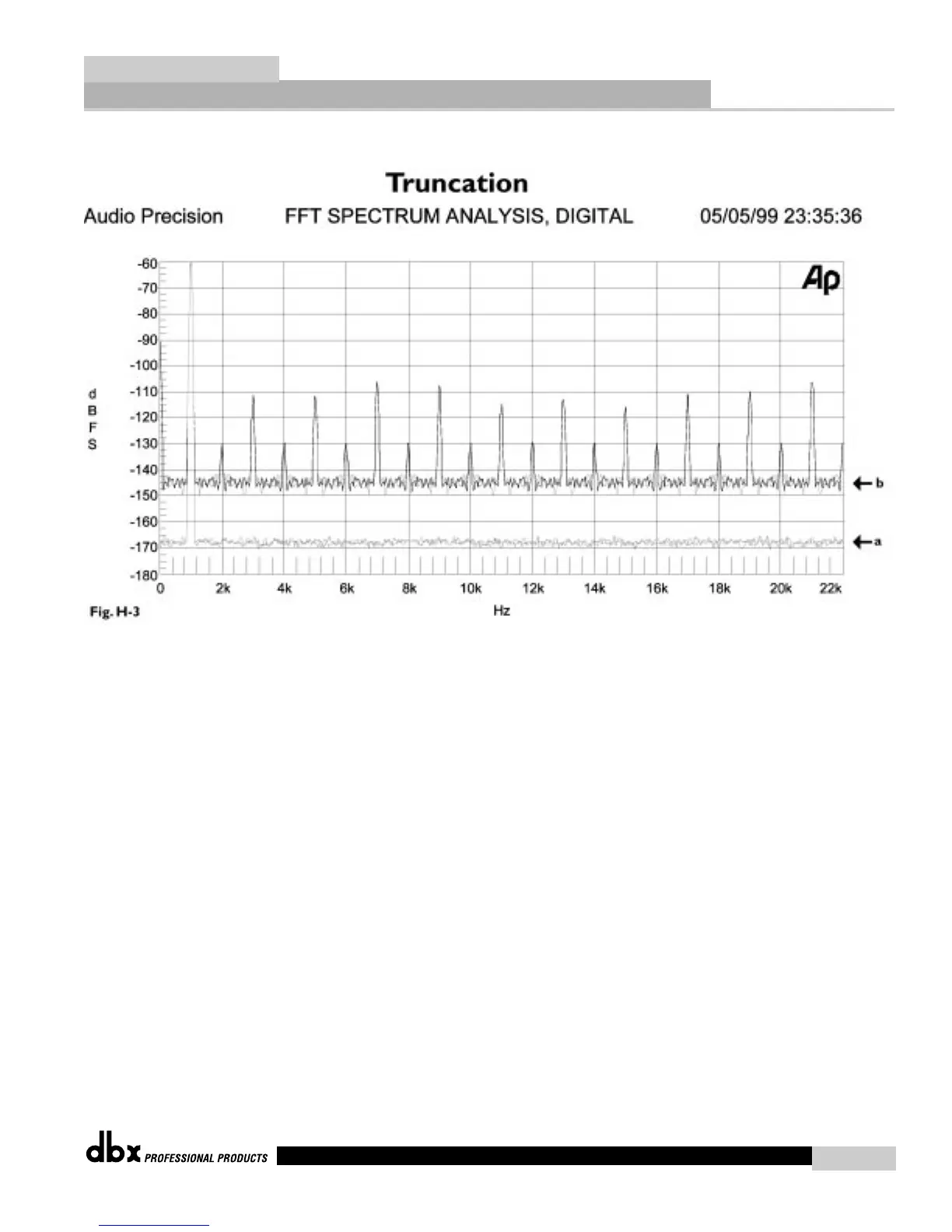 (a) 24-Bit word, (b) 16-Bit truncated output, no dither. Parameters: Input -60dBFS, 1 kHz; FFT Length= 2048, Sample