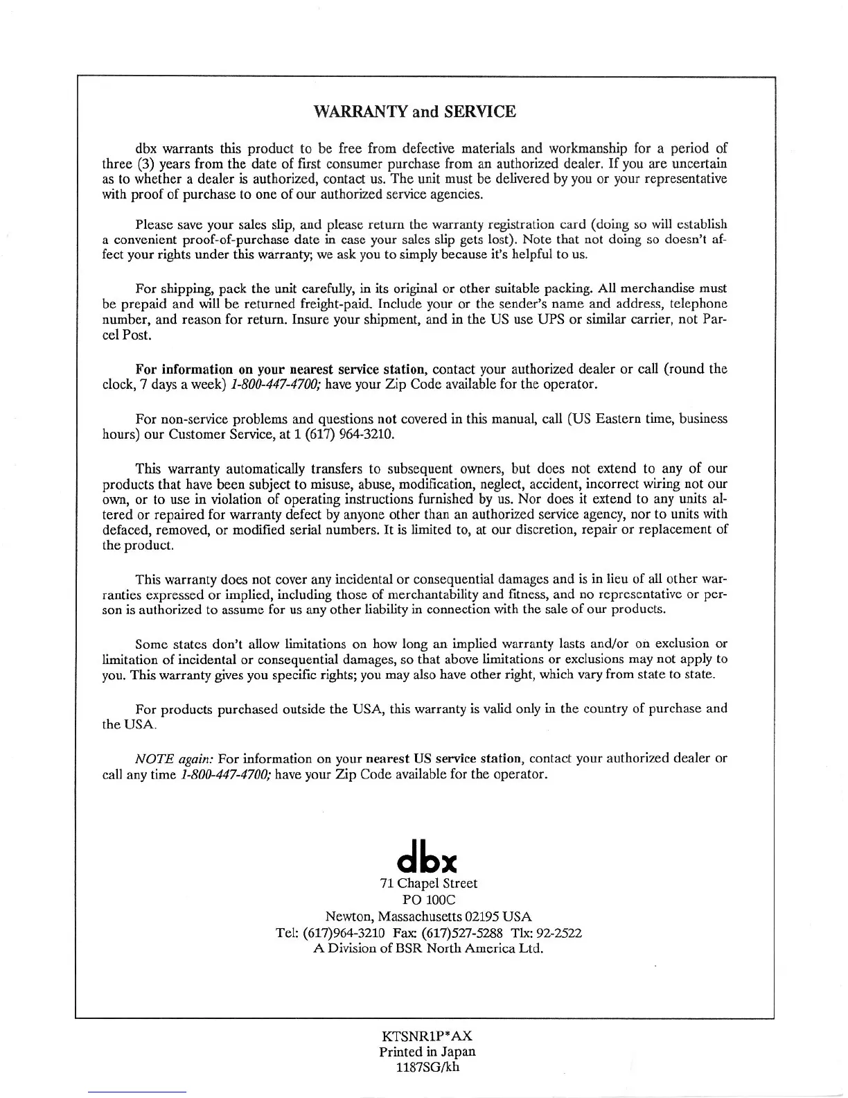 dbx SNR 1 - Warranty and Service Information