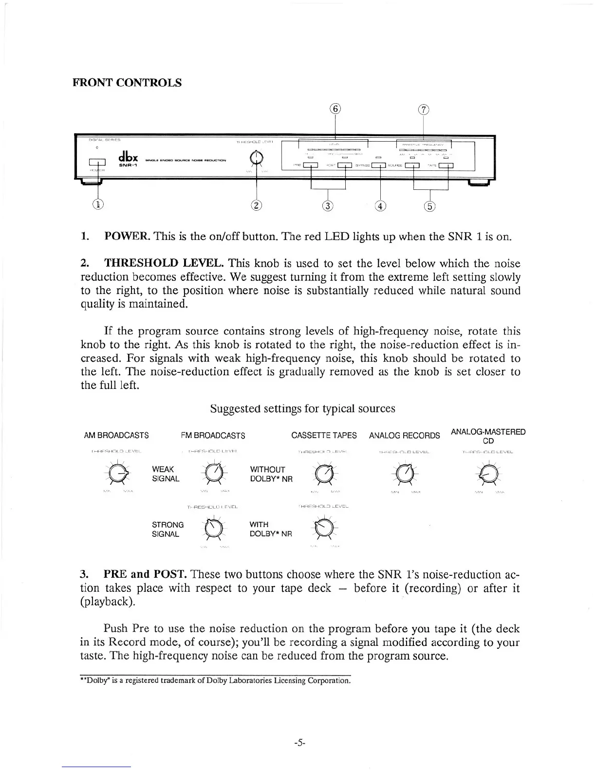 dbx SNR 1 - Front Panel Controls Overview; Power and Threshold Level; Pre;Post and Bypass Modes; Source Selection