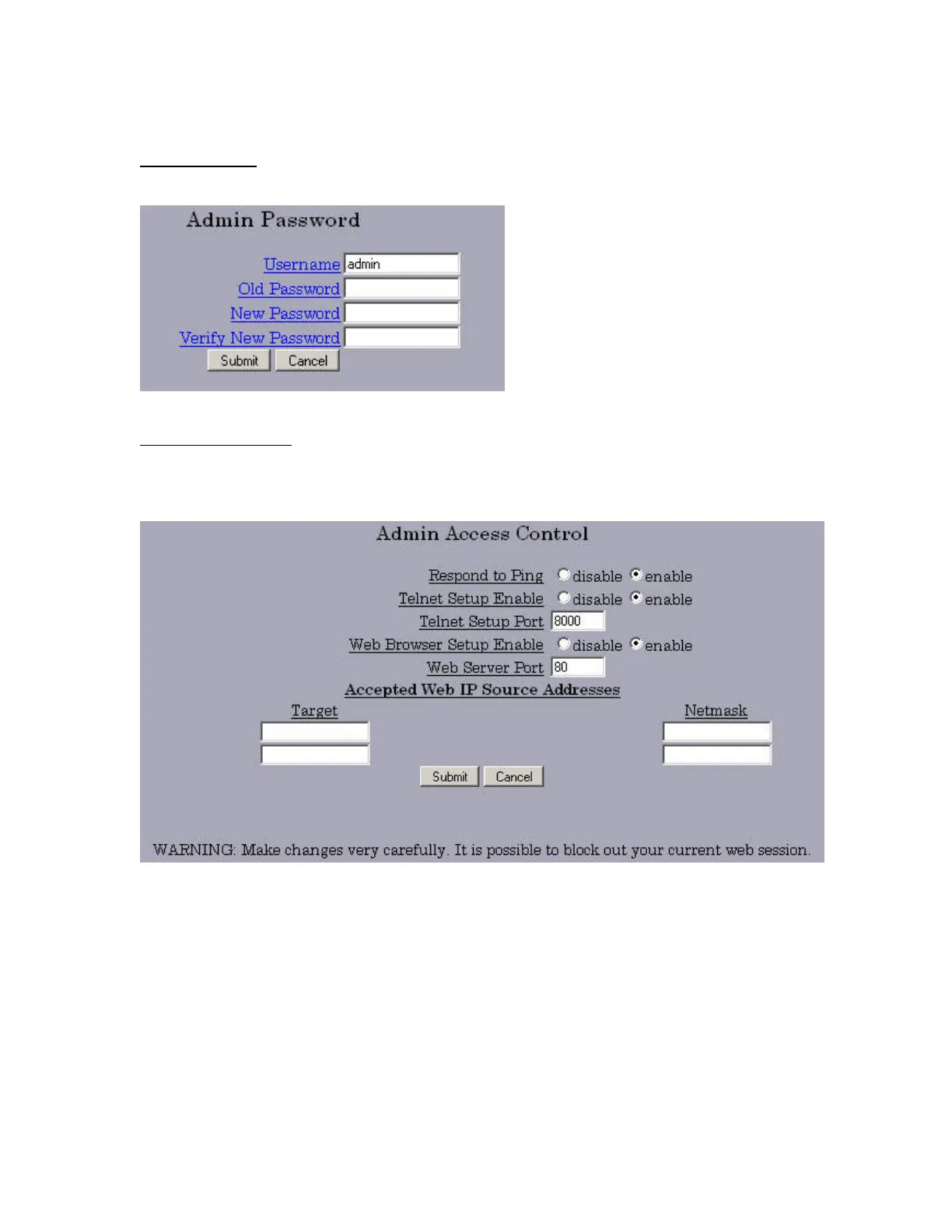Admin Access Control. Ping can be enabled or disabled. Telnet access can be enabled or disabled.