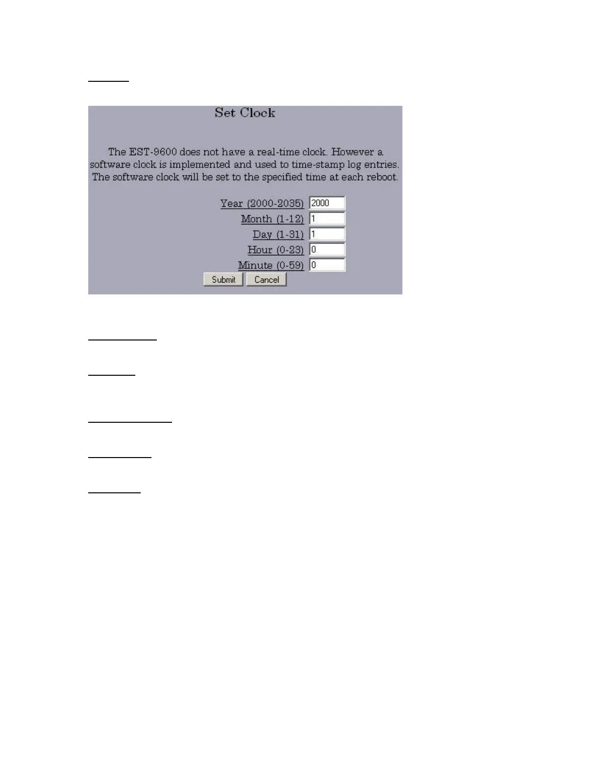 Set Clock sets a relative clock, relative to the power-on time of the EST-9600. The clock is reset