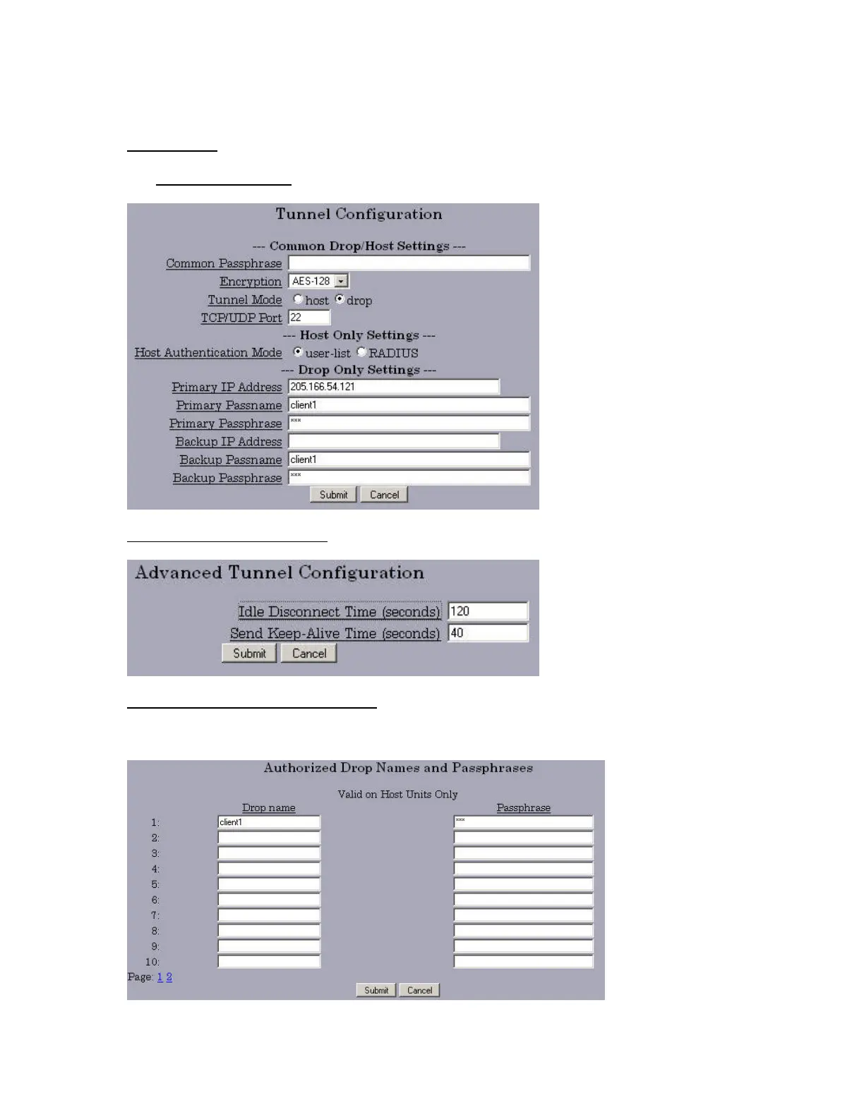 The Tunnel Configuration sub menu is used to set the Common Passphrase.