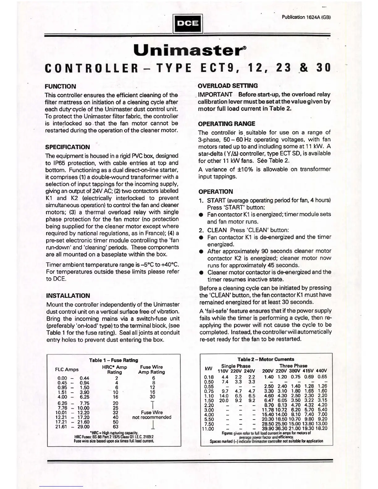 DCE Unimaster UMA 252V - Unimaster Controller Operation; Controller Functionality and Specs; Operating Procedures and Settings; Fuse;Motor Current Data