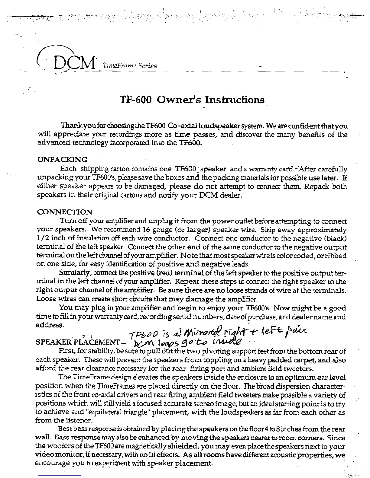 Dcm TF 600 Series - Unpacking; Connection; Speaker Placement