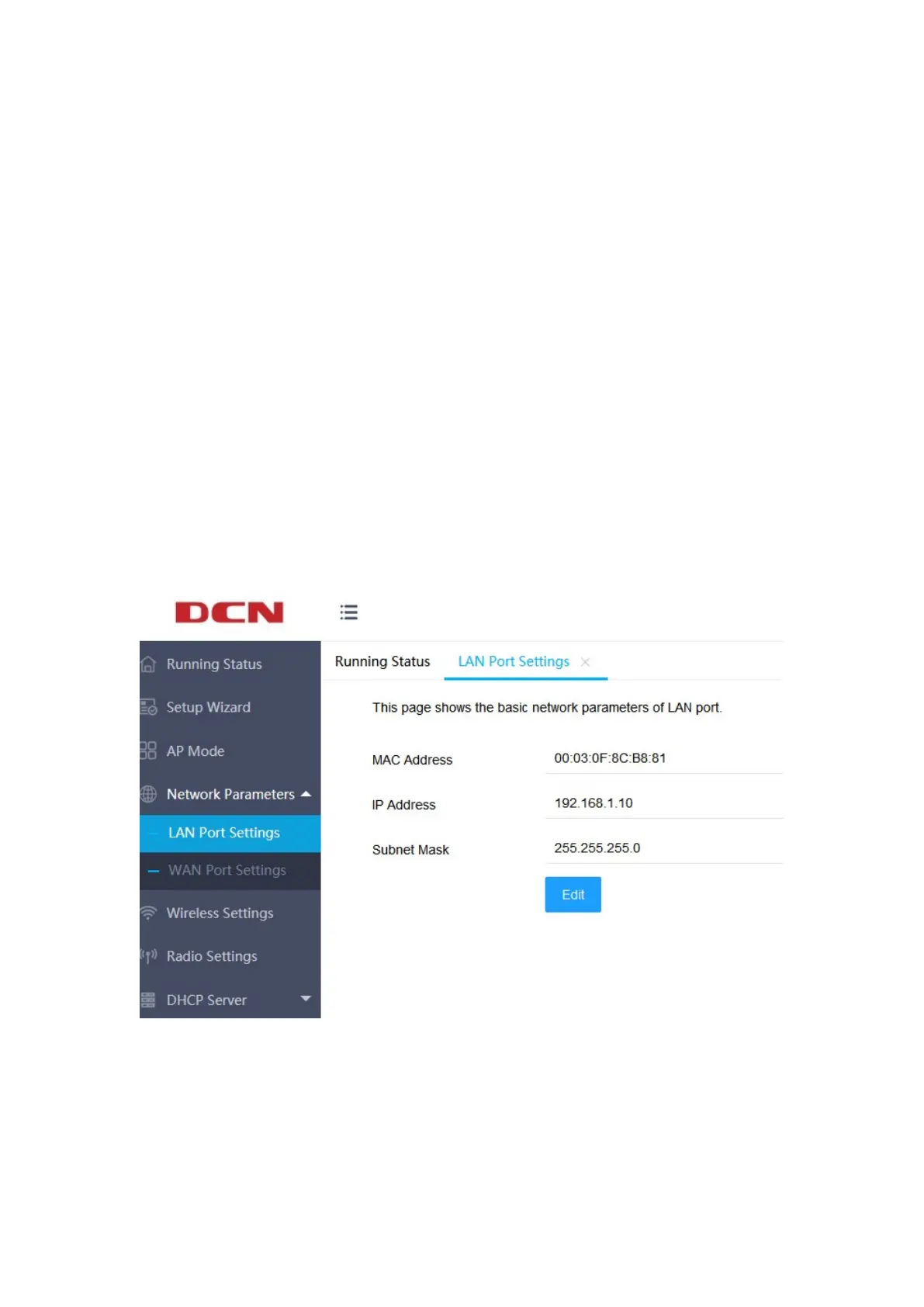 LAN side IP address and subnet mask. When the LAN port IP parameters are
