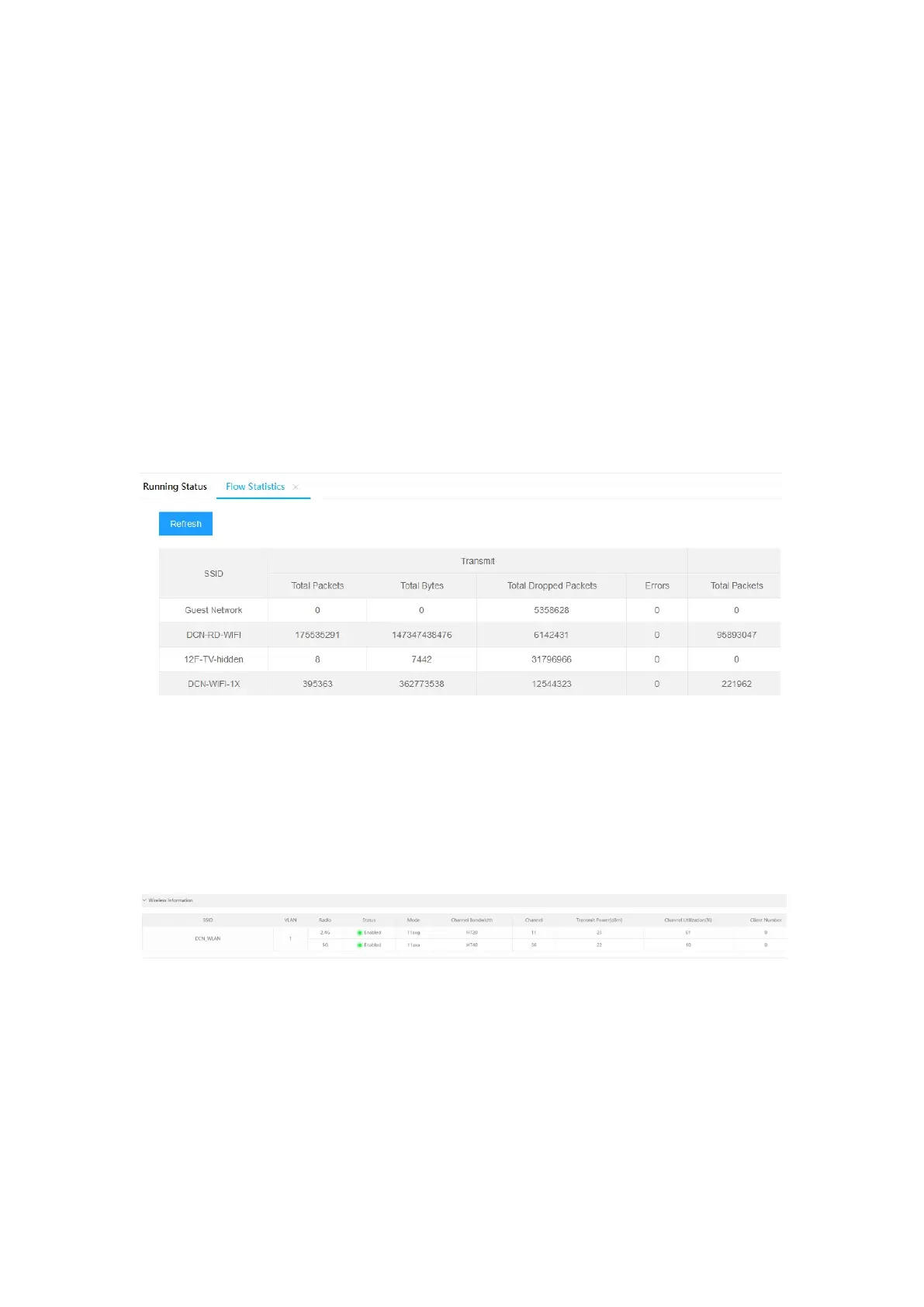 The statistics contains three parts: flow statistics, radio statistics and client