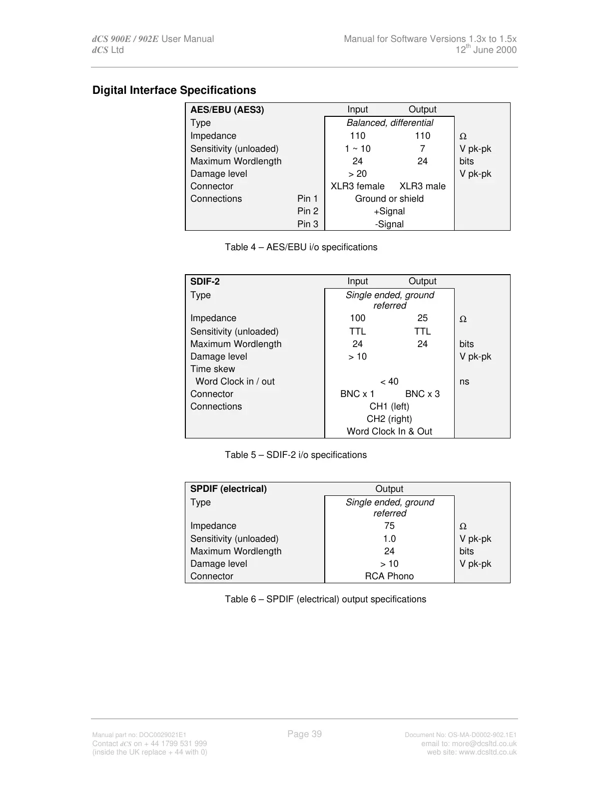 Table 5 – SDIF-2 i/o specifications