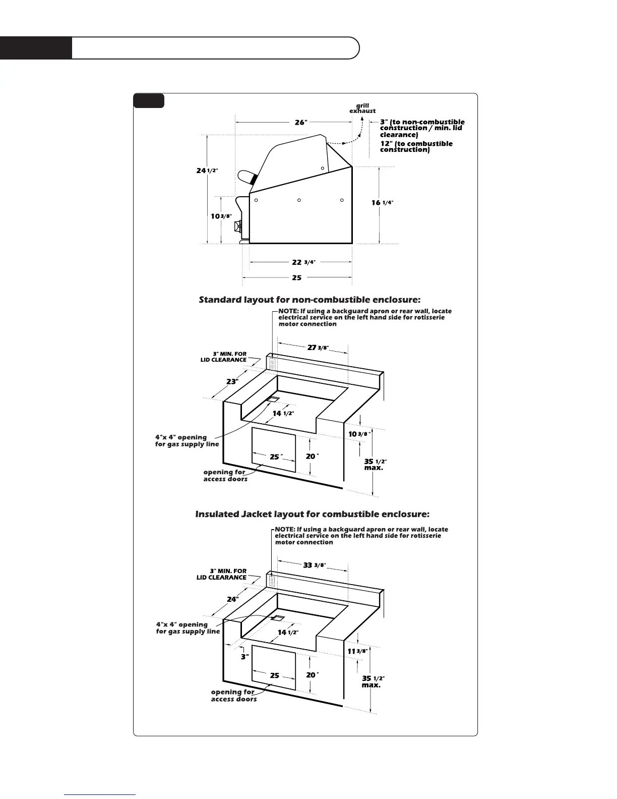 DCS BG27-BQRL - Built-In Construction Details; Standard Layout for Non-Combustible Enclosures; Insulated Jacket Layout for Combustible Enclosures
