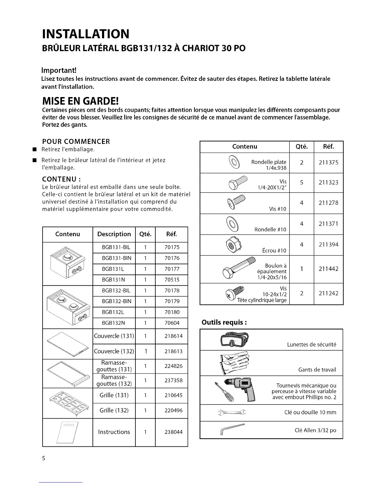 Celle-ci contient le brQleur lateral et un kit de materiel