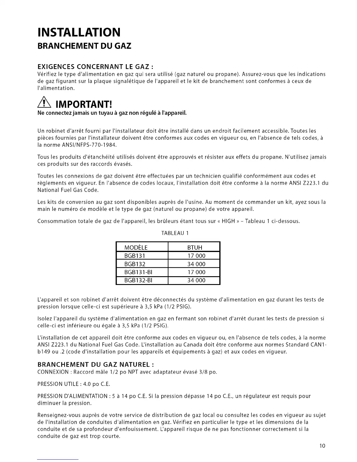 Toutes les connexions de gaz doivent _tre effectu_es par un technicien qualifi_ conform_ment aux codes et