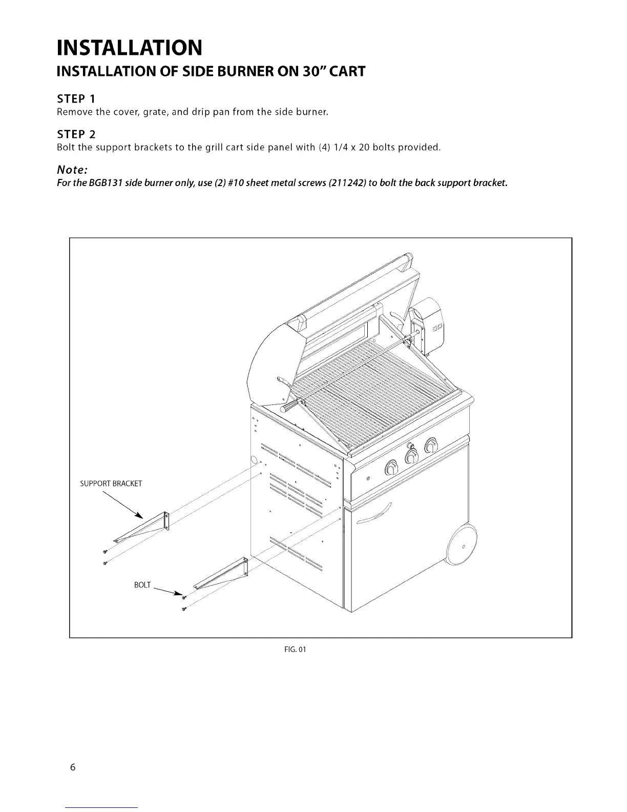 For the BGB131 side burner only, use(2) #I0 sheet metal screws (211242) to bolt the back support bracket.