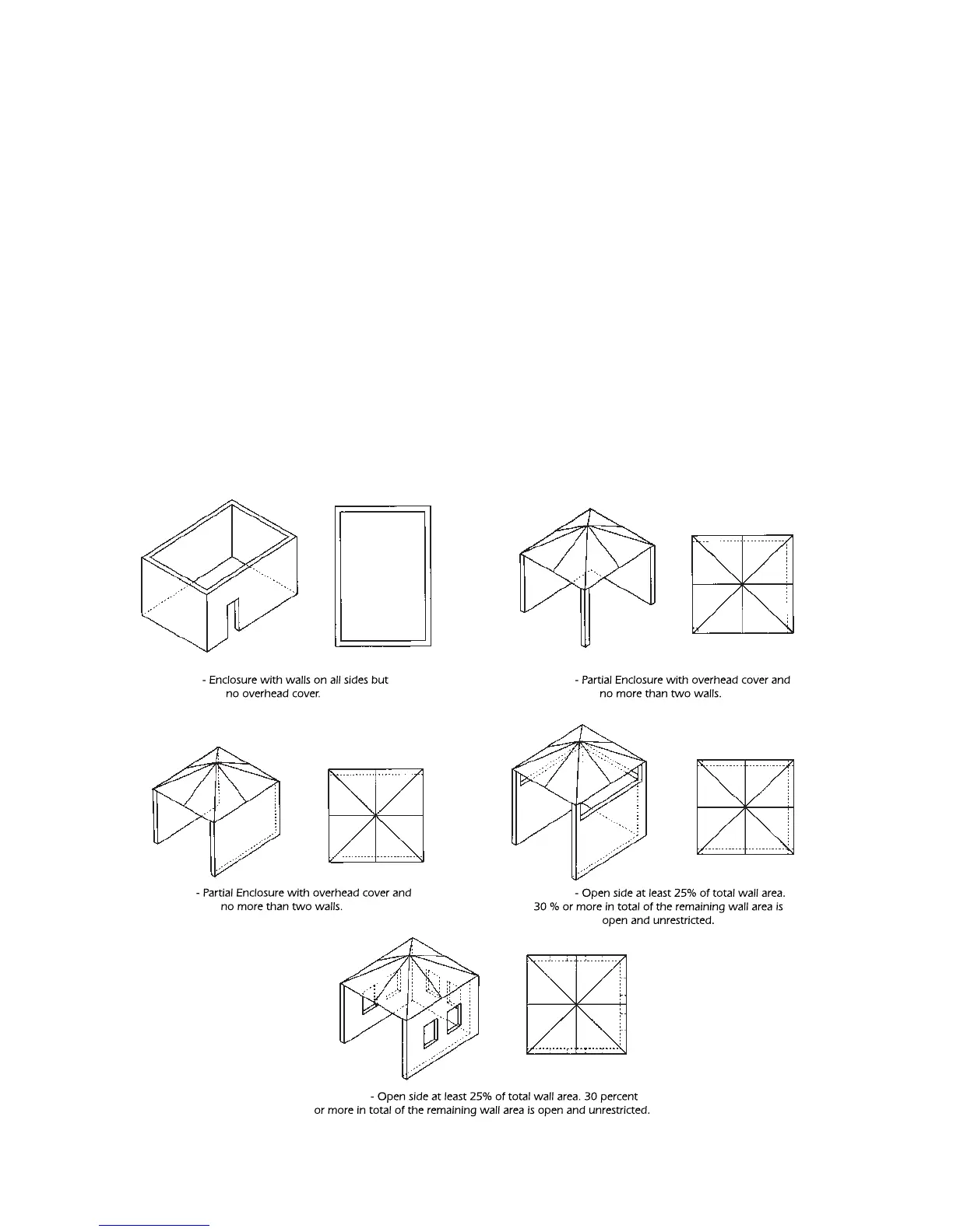 Within a partial enclosure that includes an overhead cover and more than two walls, the following shall apply: